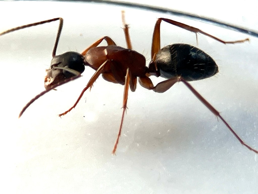 I collected these photographs because I really appreciated the cool picture window patterns on the wings. This is one characteristic of fruit flies. This is also a female specimen as you can see from the longish posterior appendage, her oviscape. Last week, I tried to create a space away from social media to decompress, so I sketched her (to the best of my ability) and used my colored pencils to bring her to life. Probably I did not get all her bristles in the right places. On flies, bristles are diagnostically quite important. I’m not quite there with my artistic rendering, but it was a relaxing activity.