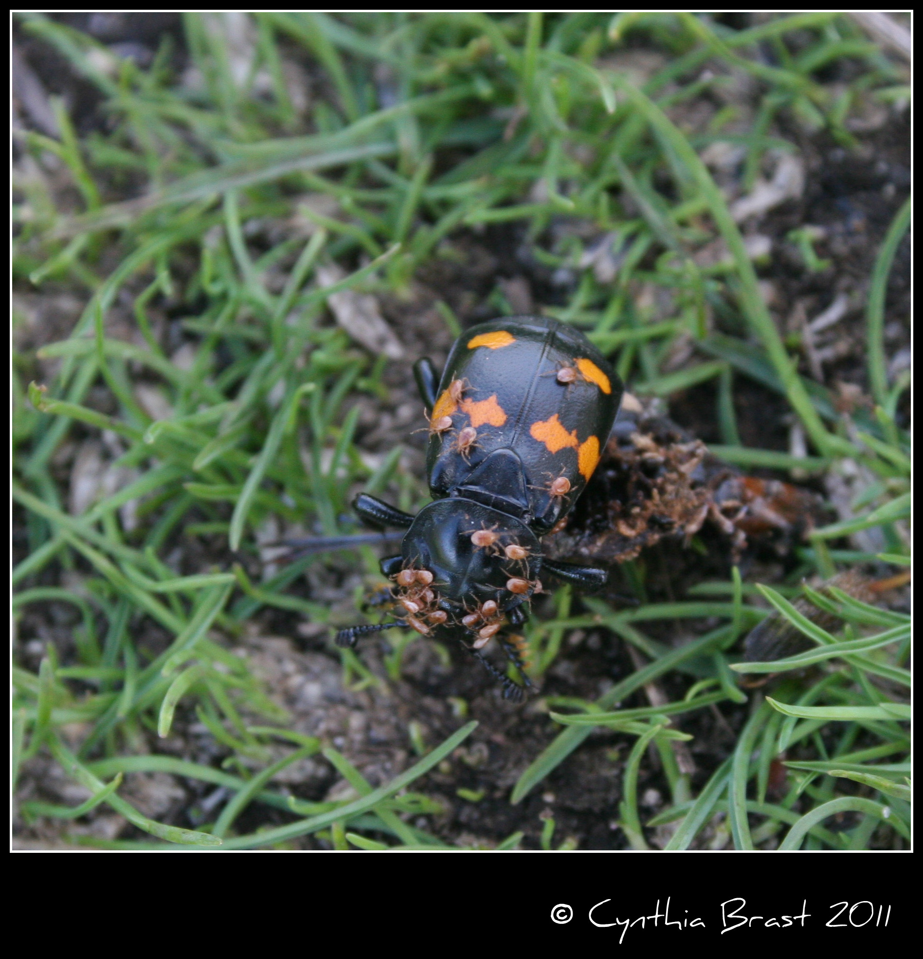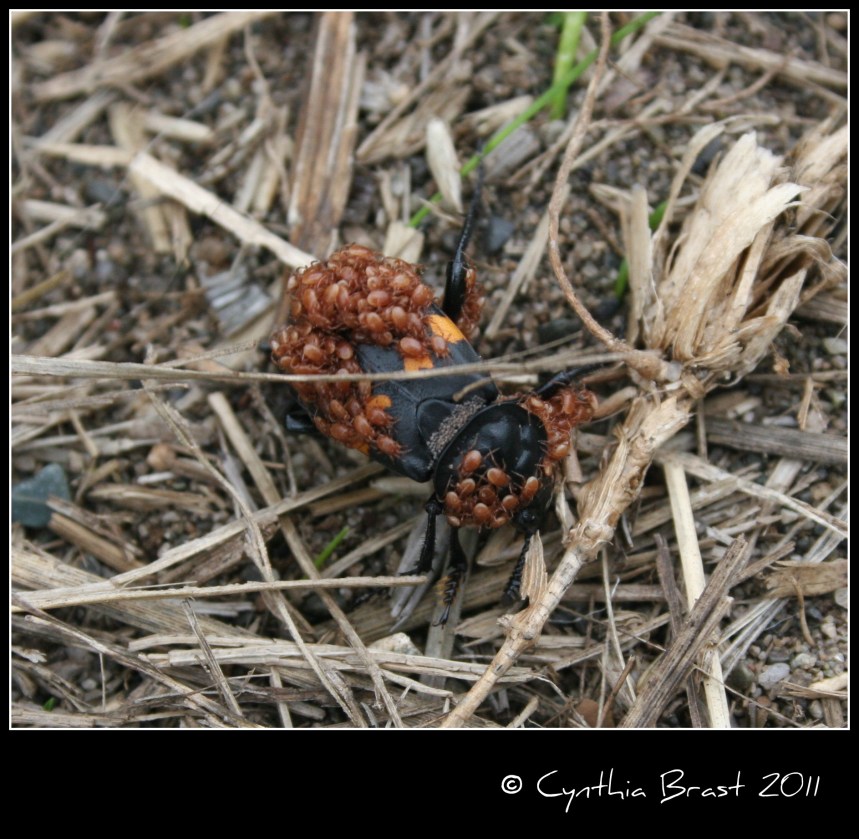 Have you ever seen this really interesting beetle that scavenges for carrion and buries it underground? Here’s one I photographed at San Juan Island National Historical Park’s American Camp. Traveling with a load of phoretic mites (phoresy means to hitch a ride), he was following his fine-tuned chemo-sensors (located on his antennae) on the trail of a dead animal.