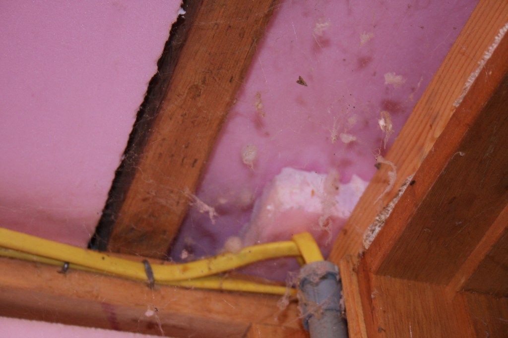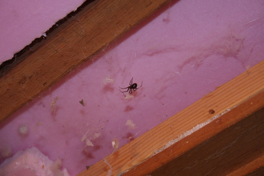 Steotoda grossa female (upper center, above red mark) with egg sacks