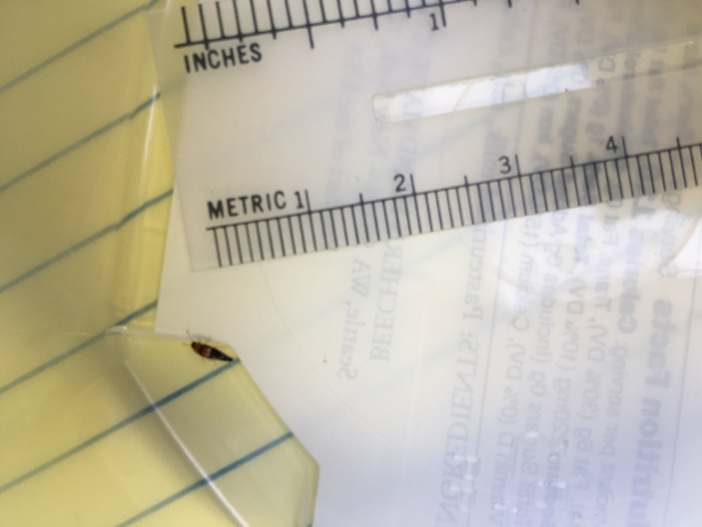 I found this teeny Staphylinid or Rove Beetle roving across my bathroom floor this morning. When I say “teeny,” it is exactly that! At about 3mm, I’m surprised I even saw it. π