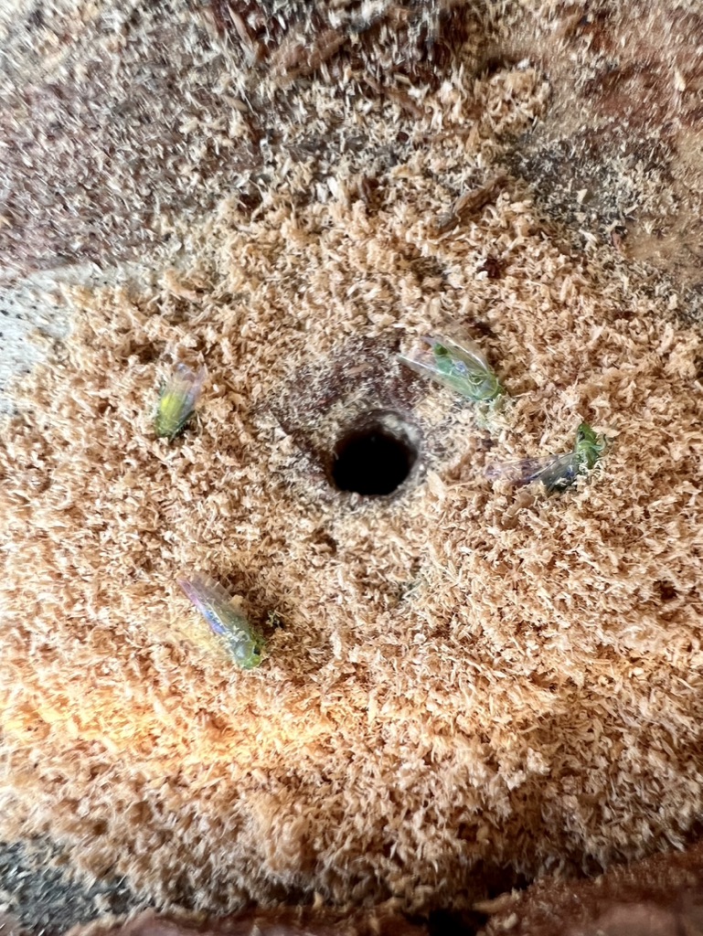 One evening, carrying out the recycles to our barn storage area, I noticed this pile of sawdust and peculiar arrangement of little green bugs around a hole in the middle on a cedar log in our yard.