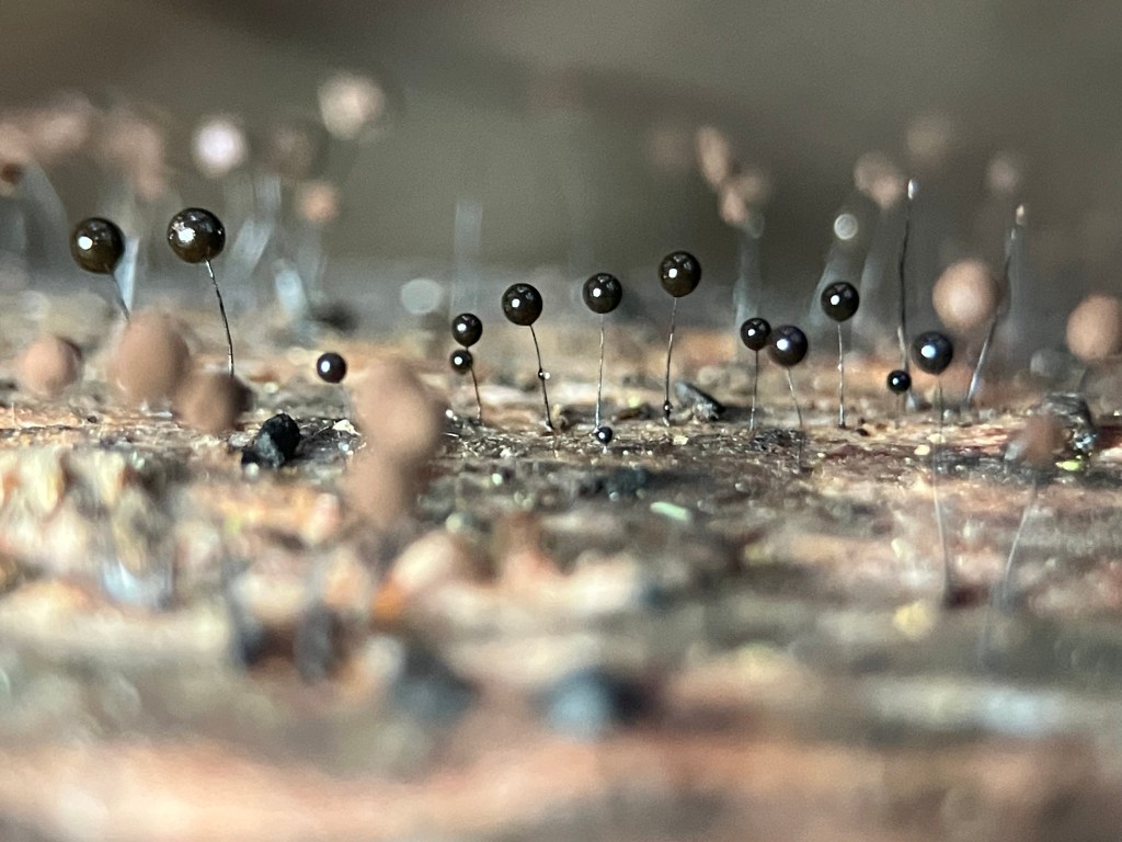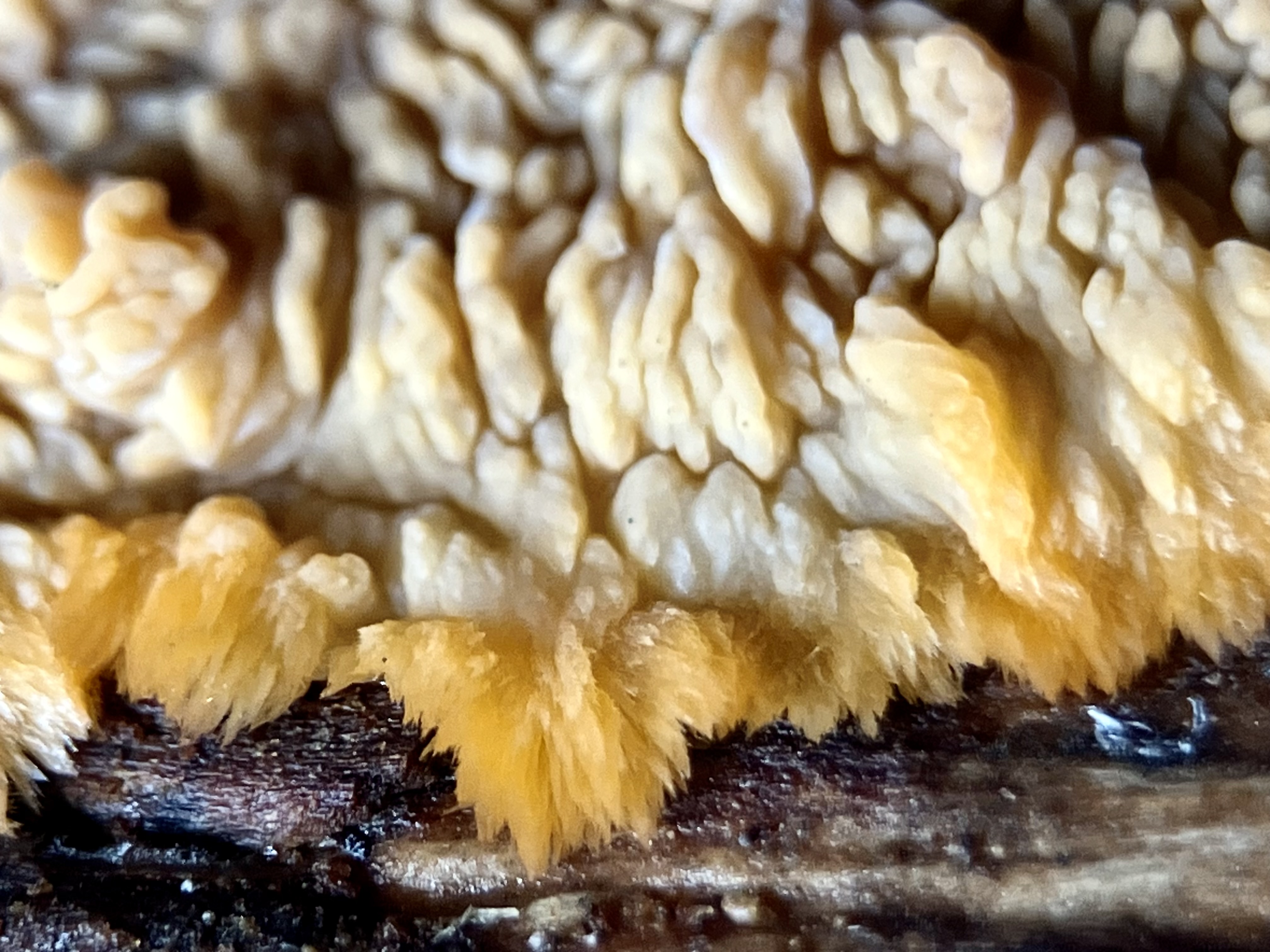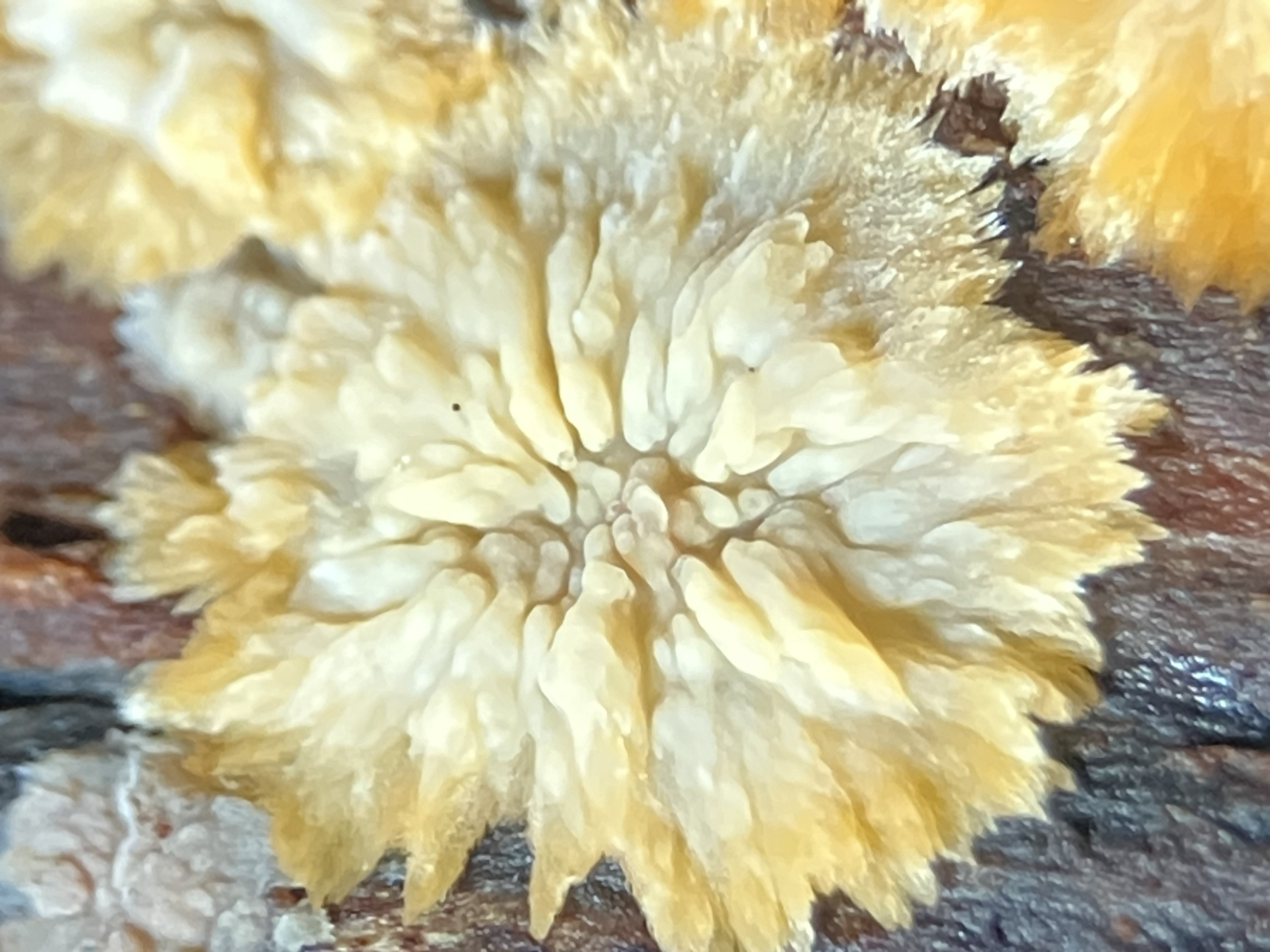 The second set of images were improved, but still not great. I noticed the underside of the log had growing patches of a crust fungi in the family Meruliacae (Genus Phlebia). There was also a little patch of slime molds (Comatricha nigra) in the family Amaurochataceae. The louse seemed to want to stay within these areas of fungi. I observed that it didn’t appreciate the light I was using to illuminate my photo taking. It was negatively phototaxic and would scurry to a shaded spot, out of the light beam.