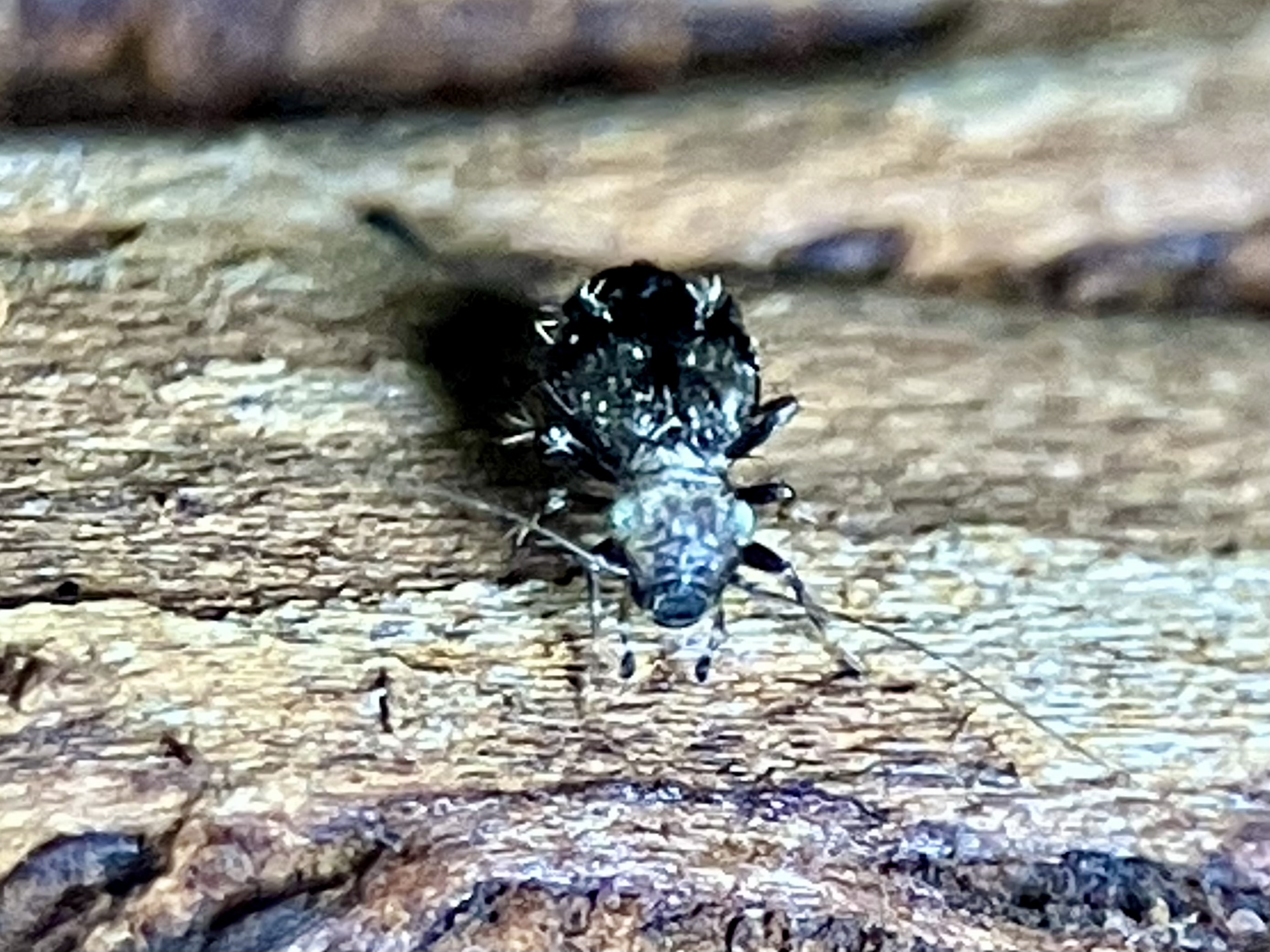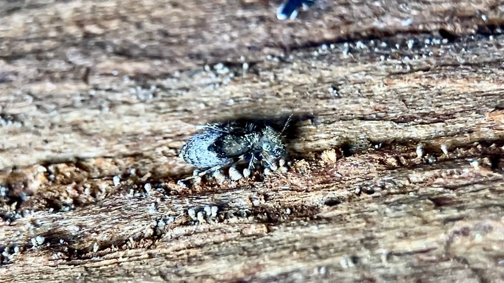 This barklouse is in the family Lepidopscocidae. Etymology is fascinating to me. Let me translate this one for you as well. Lepido means scales. Psocus comes from Ancient Greek psōkhos (ψῶχος) or the verb psōchein (ψώχειν). It means “gnawed,” “rubbed,” or “ground.” This describes the chewing mouthparts psocids use to grind fine organic matter like lichen, fungi, and detritus. In layman’s jargon, A scaly gnawer.
