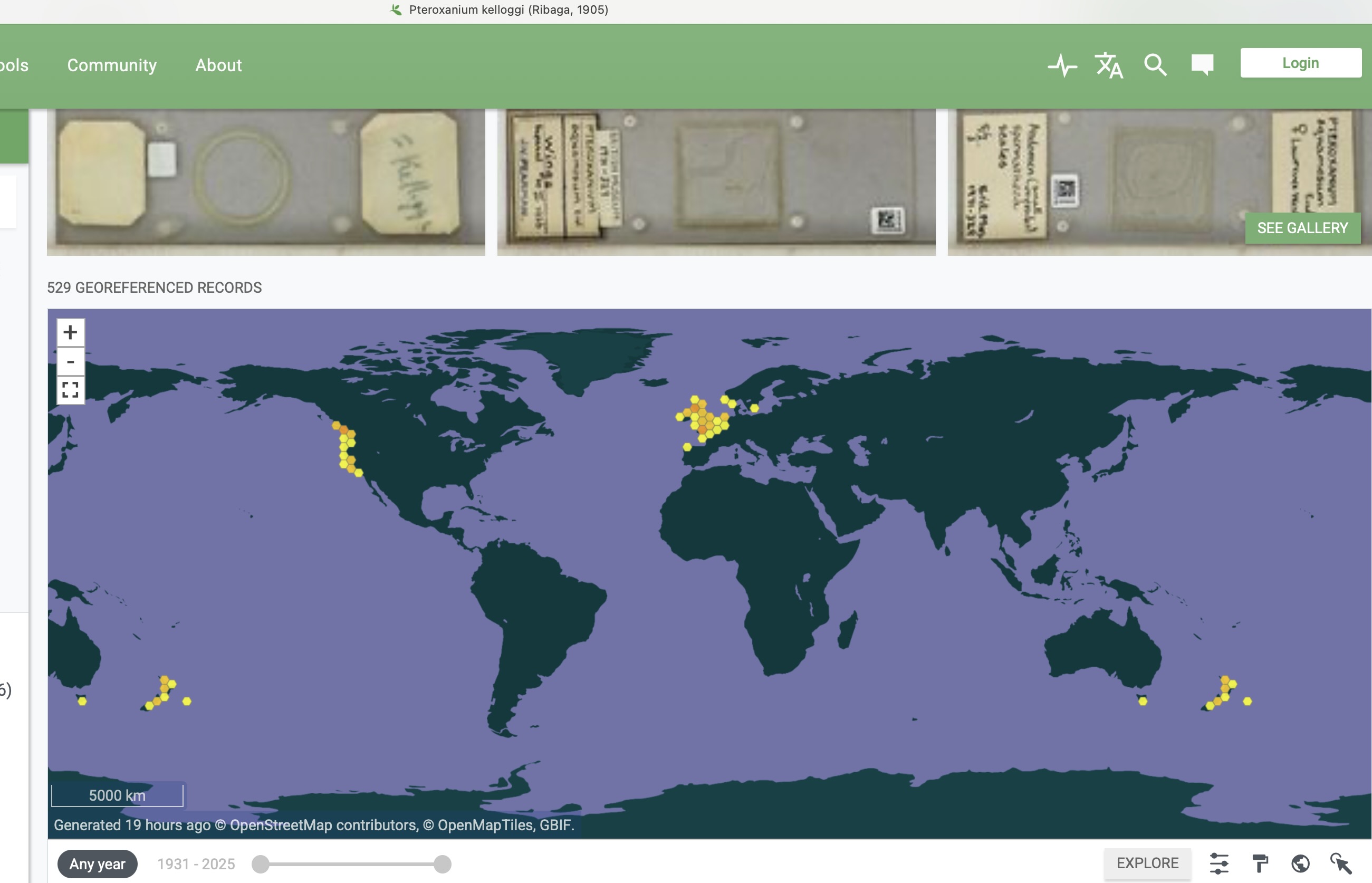 Map of observations for Pteroxium kelloggi – from GBIF.org https://www.gbif.org/species/1031796