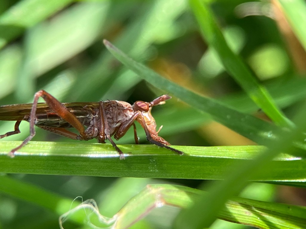 I observed this specimen for a few minutes in our unmowed yard. It’s got very cool, grasshopper-like hind legs, and weirdly, it moved (quite adeptly) backward when it was in the grass, before finally flying off.