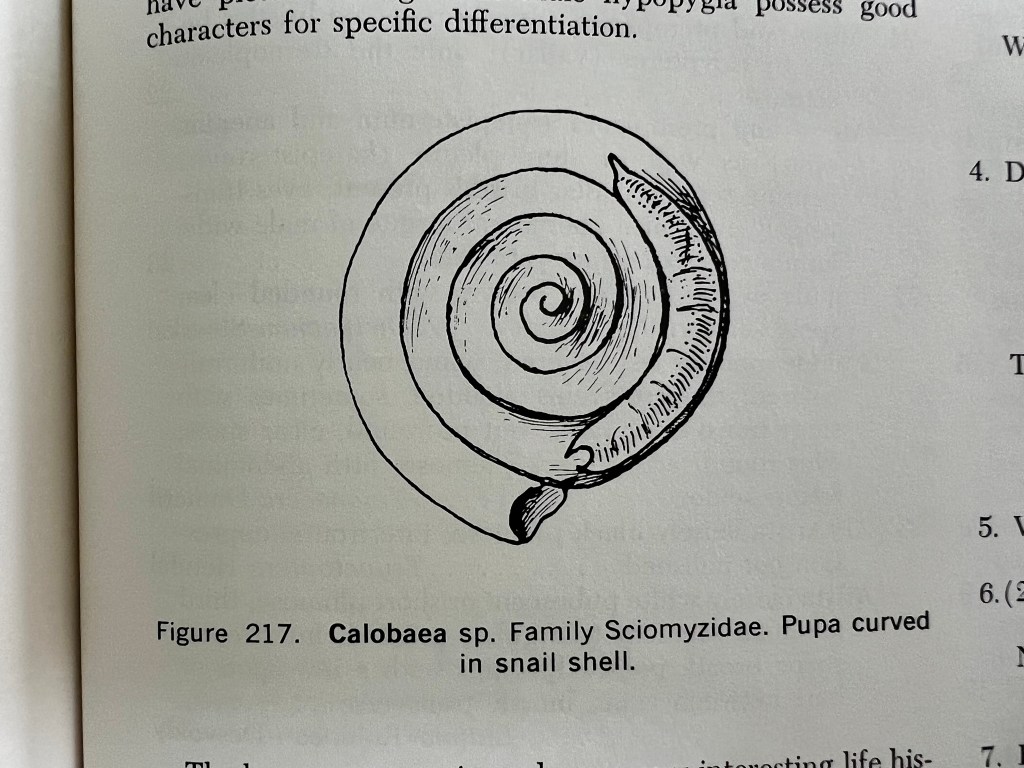 This is, as the title suggests, a Marsh Fly in the family Sciomyzidae (say “/sigh-oh-MIZ-ih-dee/”). The etymology of the name is from Greek skia meaning ‘shadow’ and myzo meaning ‘to suck.’ They are named so because the aquatic larvae of this group are parasitoids of snails, slugs, and fingernail clams. They are also referred to as Snail Killers. Some larvae are actually predatory and “hunt and kill” up to 30 snails before they reach their pupation stage of development. This particular species is Sepedon fuscipennis.