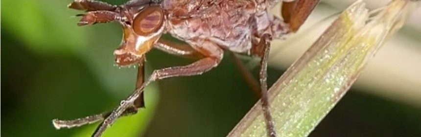 This is, as the title suggests, a Marsh Fly in the family Sciomyzidae (say “/sigh-oh-MIZ-ih-dee/”). The etymology of the name is from Greek skia meaning ‘shadow’ and myzo meaning ‘to suck.’ They are named so because the aquatic larvae of this group are parasitoids of snails, slugs, and fingernail clams. They are also referred to as Snail Killers. Some larvae are actually predatory and “hunt and kill” up to 30 snails before they reach their pupation stage of development. This particular species is Sepedon fuscipennis.