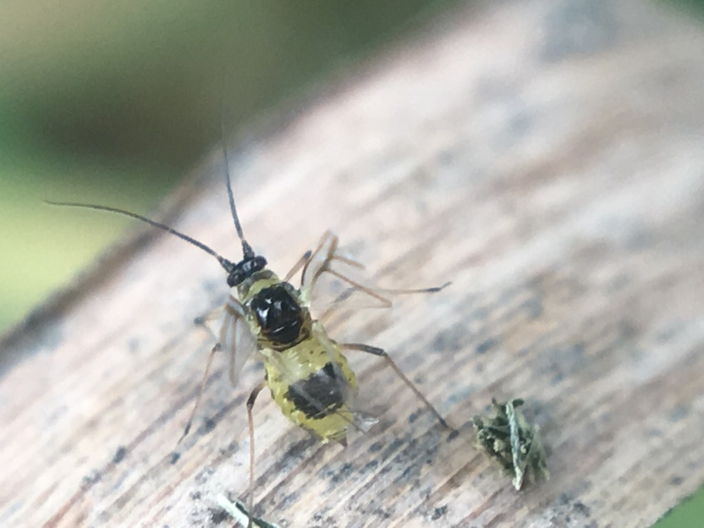 I mentioned there can be A LOT of aphids! So, exactly how fast do they reproduce? Adult female aphids can give birth to as many as 12 live offspring per day! No male needed. The young aphids, called nymphs, are born looking like a junior-sized version of the parent. They will molt (shed their skin) several times before they reach a full-size adult. If the weather is warm, these nymphs can achieve adulthood, and the ability to reproduce, in as few as 7-8 days. When I think of 80 offspring per adult aphid, per week, sucking the life out of my garden plants, I have my own alarm pheromones going off!