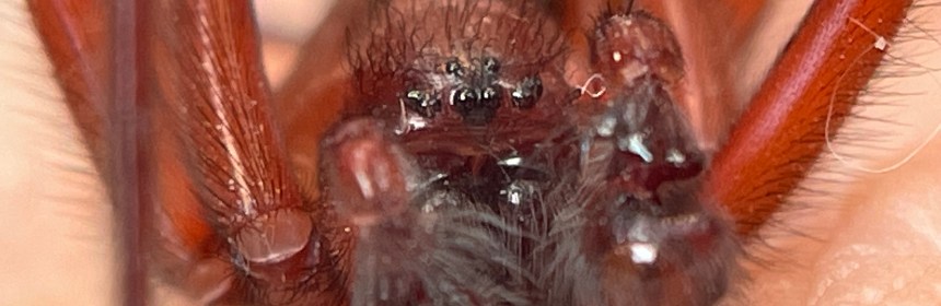 This sweet little dude is a Hackelmesh Weaver. His scientific name is Callobius severus. He’s harmless (a friend). He was only trying to find a mate. Male spiders often wander this time of year in search of a female. Look at those little palps! Those are the organs the male spider uses to transfer sperm to the female. They looks like little paws…or maybe tiny furry boxing gloves. I’m sorry this fella didn’t find a friend. May he R.I.P.