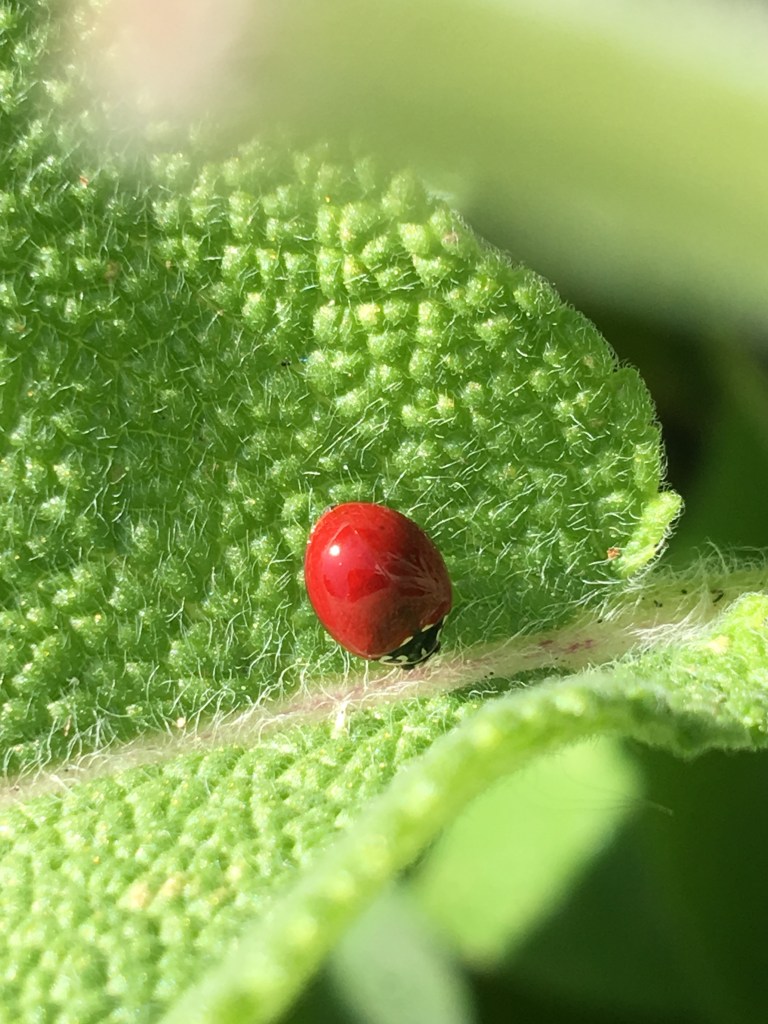 If you are someone who needs reading glasses (like me) to see things up close, you could easily be fooled into thinking the spot of red on the plant leaf is a drop of blood. Given how accident prone I am, when I first spotted this one, I figured I’d poked my finger again on one of the prickly berry vines that are coming up in my raised garden beds. Upon closer inspection, I was glad I had my camera phone handy.