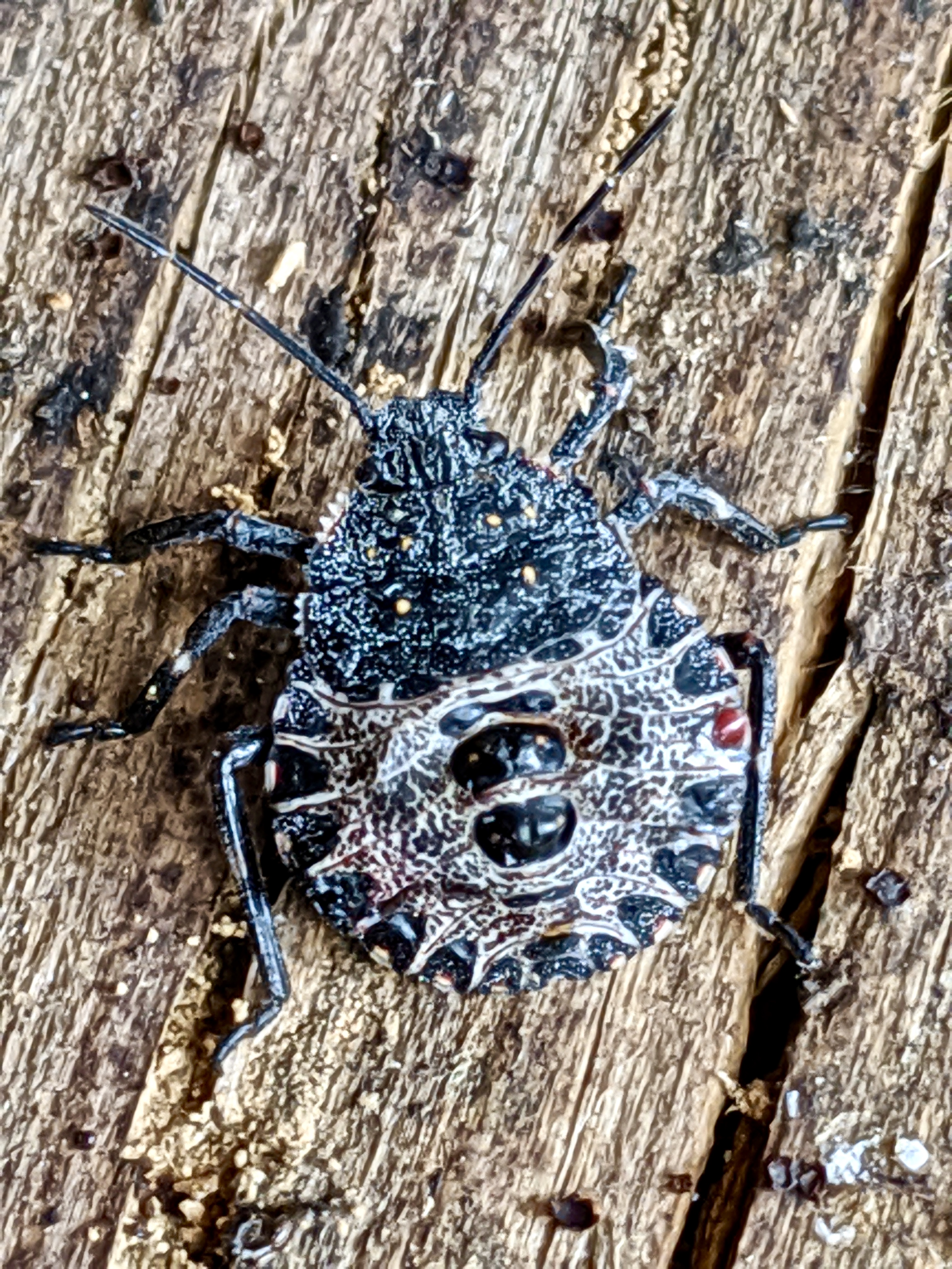 This is a quick post! I just wanted to share the stink bug nymph I found over the weekend (Sunday, Sept. 1, 2019). It’s a Rough Stink Bug nymph, in the genus Brochymena. I believe it’s Brochymena quadripustulata, the Four-humped Stink Bug. However, Brochymena sulcata and B. affinis are two other species found in our area so similar, they are difficult to distinguish.