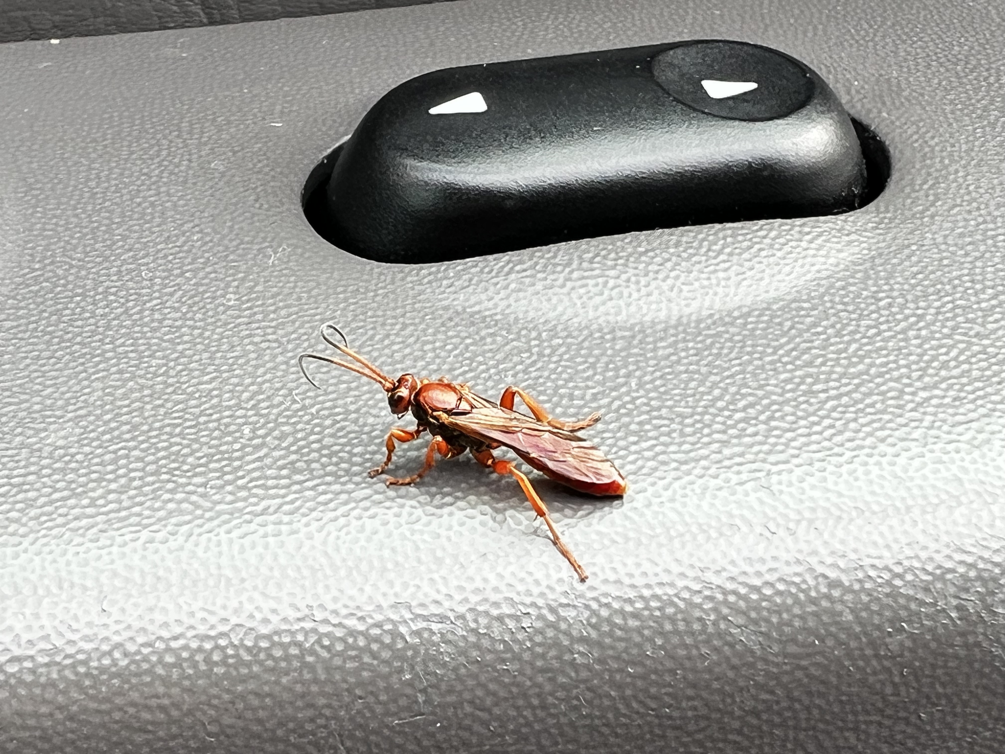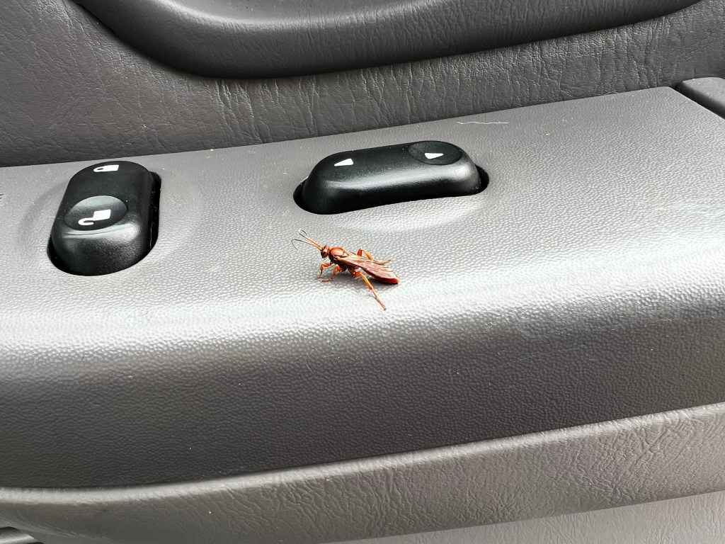 Today as I was leaving the store after grocery shopping in Friday Harbor at Marketplace (the store it took me forever to find when I first moved here, and known as the store for the “locals”), I opened the door to my truck and found this cute little red wasp on the door handle. I’m not sure how it got there, but this is one hitch-hiker I had no problem picking up. And, pick it up, I did! I conveniently scooped it to safety in a brand new insulated cup I scored on sale at our local Ace Hardware for $10. It has little bears and forest trees on it. It was also perfect for securing the wasp for our ride back to the house.