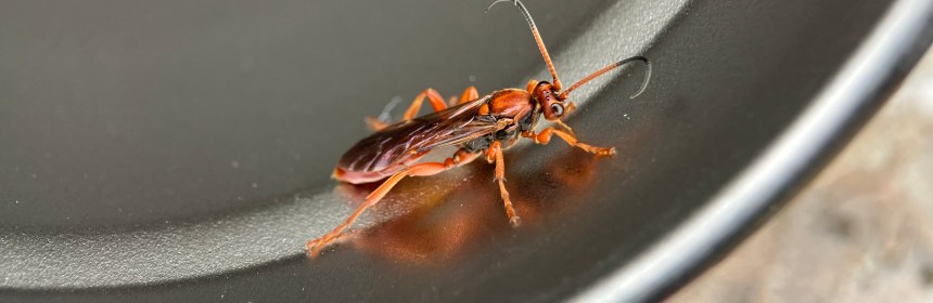 The wasp critter is in the family Ichneumonidae. It’s in the Genus Spilichneumon, I believe. These wasps hunt and parasitize Noctuid moth caterpillars. They are most excellent pest predators! The female wasp will lay one egg inside each caterpillar she finds and then her egg will hatch and the larva will develop in the caterpillar’s body. That’s THE END of the caterpillar. 🐛