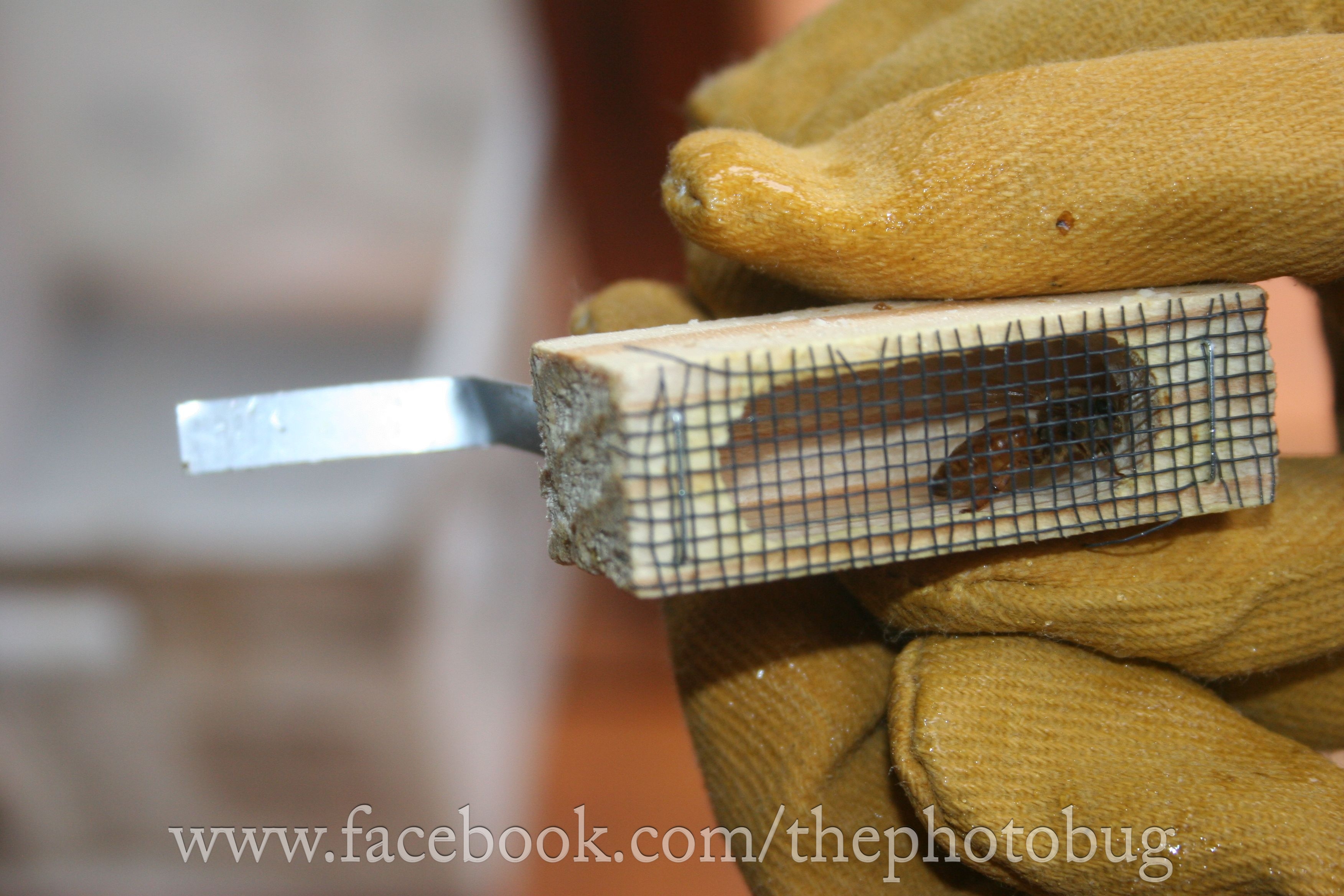 Next, I removed the queen.  Her wooden cage was hung in the package with a small metal extension that hooked into a groove at the top of the package.  I slid the metal through the groove and then removed the cardboard makeshift cover over the top to allow me to bring the queen cage out.   I replaced the cardboard over the package opening and set my hive tool on top to hold it in place while I checked the queen.