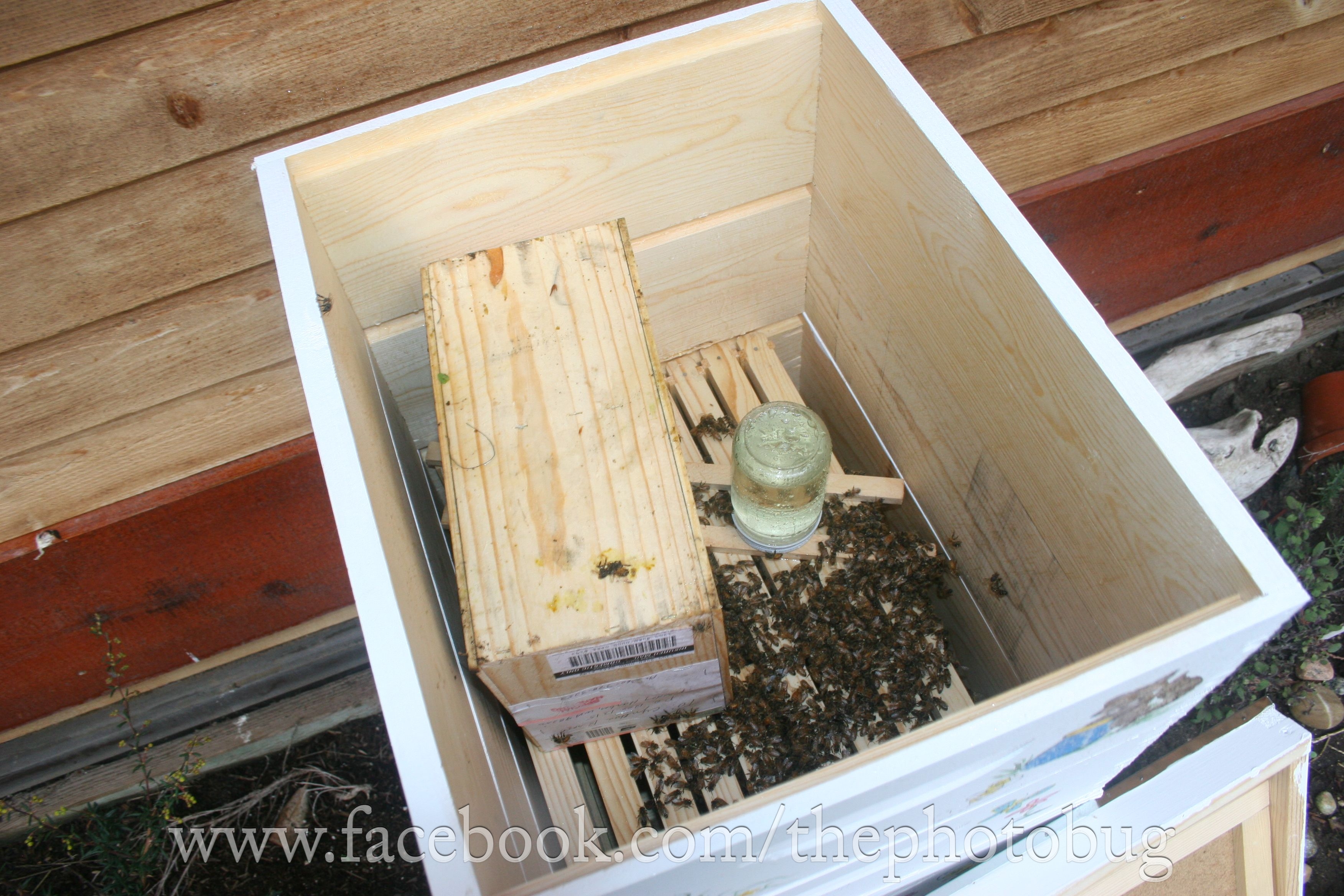 After positioning the package so I could leave it in the hive overnight, I then set the jar feeder I had prepared next to the package.  The jar feeder I inverted and set on two small wood pieces that would elevate the jar just enough to allow the bees easy access.  This also went extremely well and I was able to complete the installation by placing the inner and outer cover on the hive.