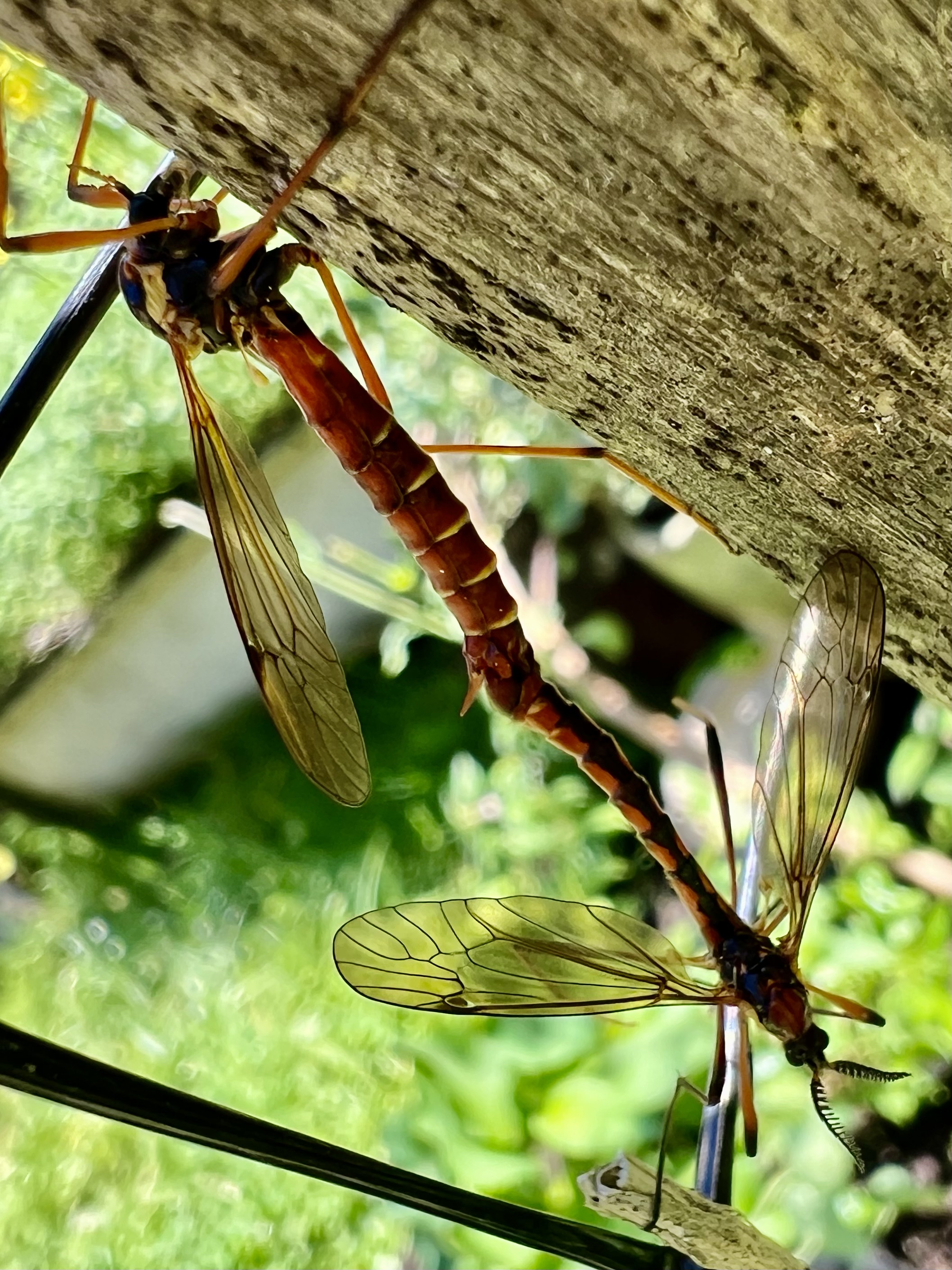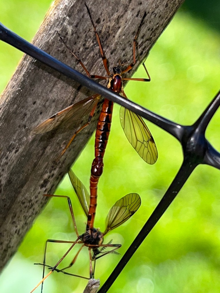 Back to the antennae for these Tiger Craneflies. Can you spot the male and the female in my photos? The male antennae are quite distinctive with their comb-like shape. Entomologists describe the comb-like antennae as Pectinate. If you haven’t figured it out yet, the male is the smaller of the pair. His antennae are wider, and he’s hanging on the bottom.
