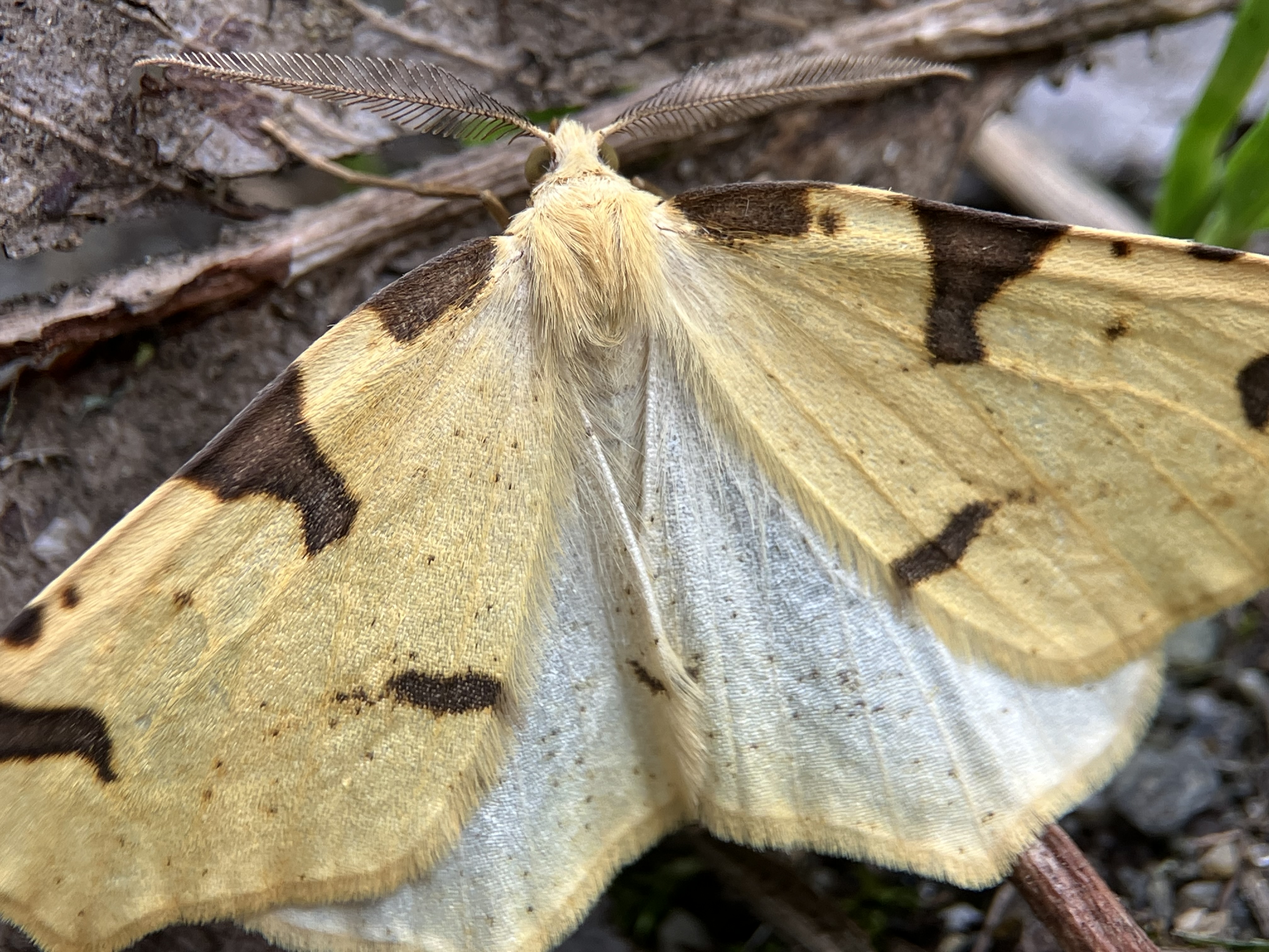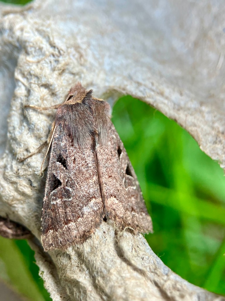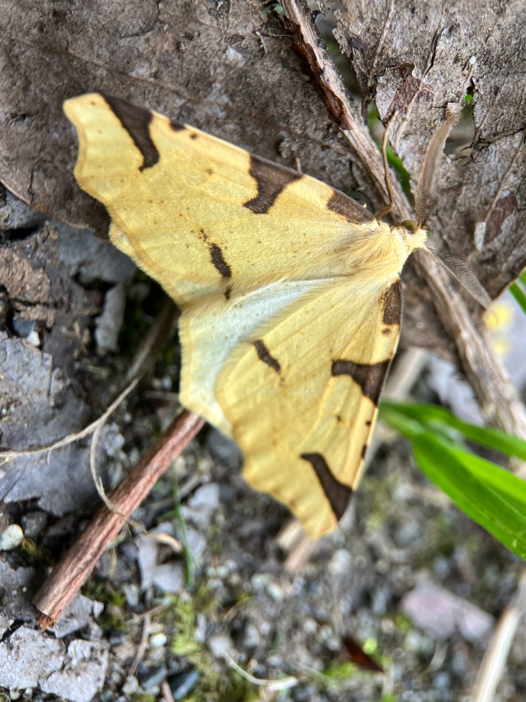 Larvae are twig mimics. Pupae sleep through the winter wrapped in a leaf, another reason to “leave the leaves” and refrain from burning or bagging and discarding the leaves around your home. You could inadvertently impact overwintering species like these and others. Adults are approximately 14-20mm (forewing length). You will see adults in flight between April-June in our area. From what I have been able to find as to the etymological meaning of the name, Neoterpes may translate to “new delight” and trianguliferata refers to the triangle-shaped markings on the forewings. It was indeed a delight to see this beauty today! A bit of sunshine on a rainy spring day.