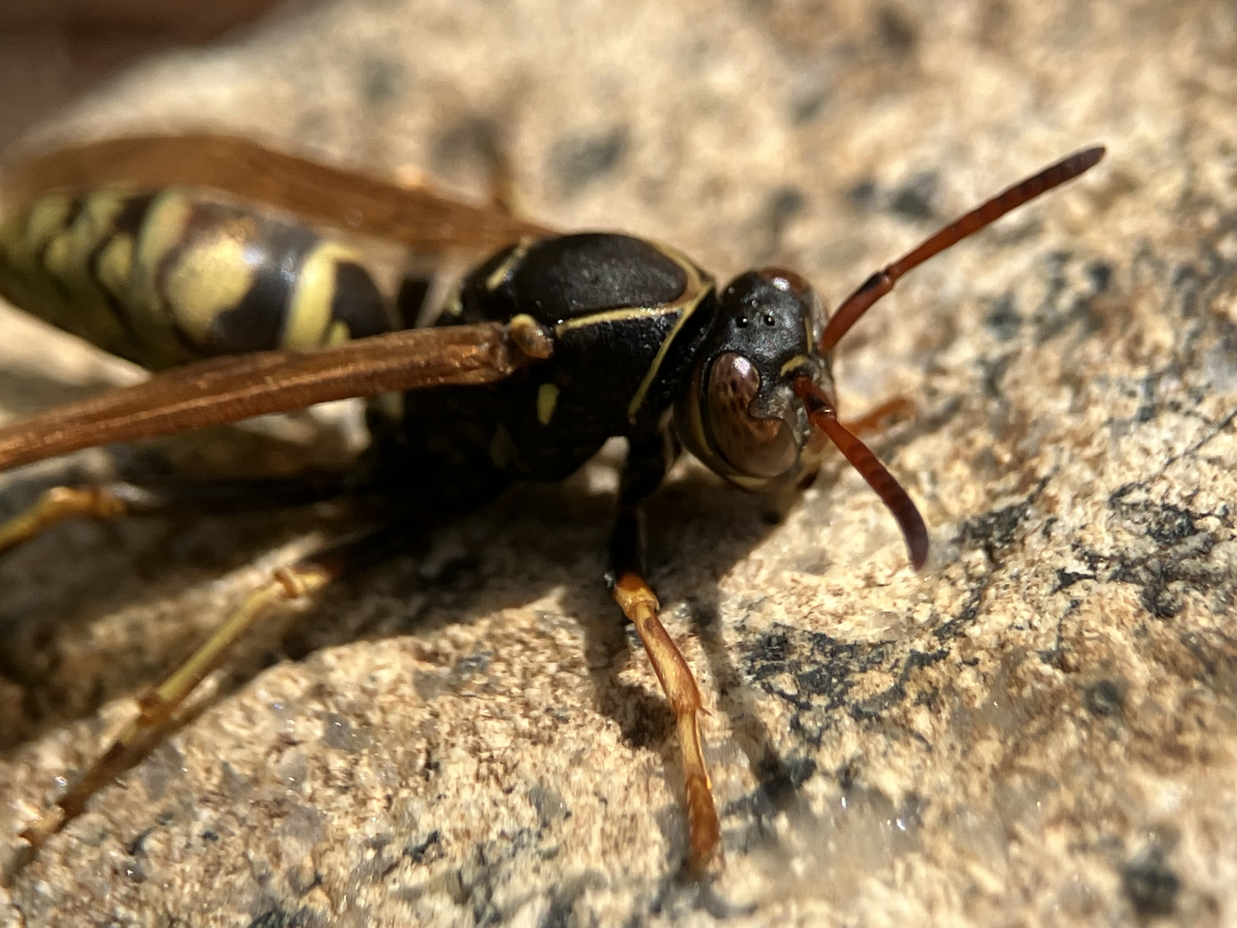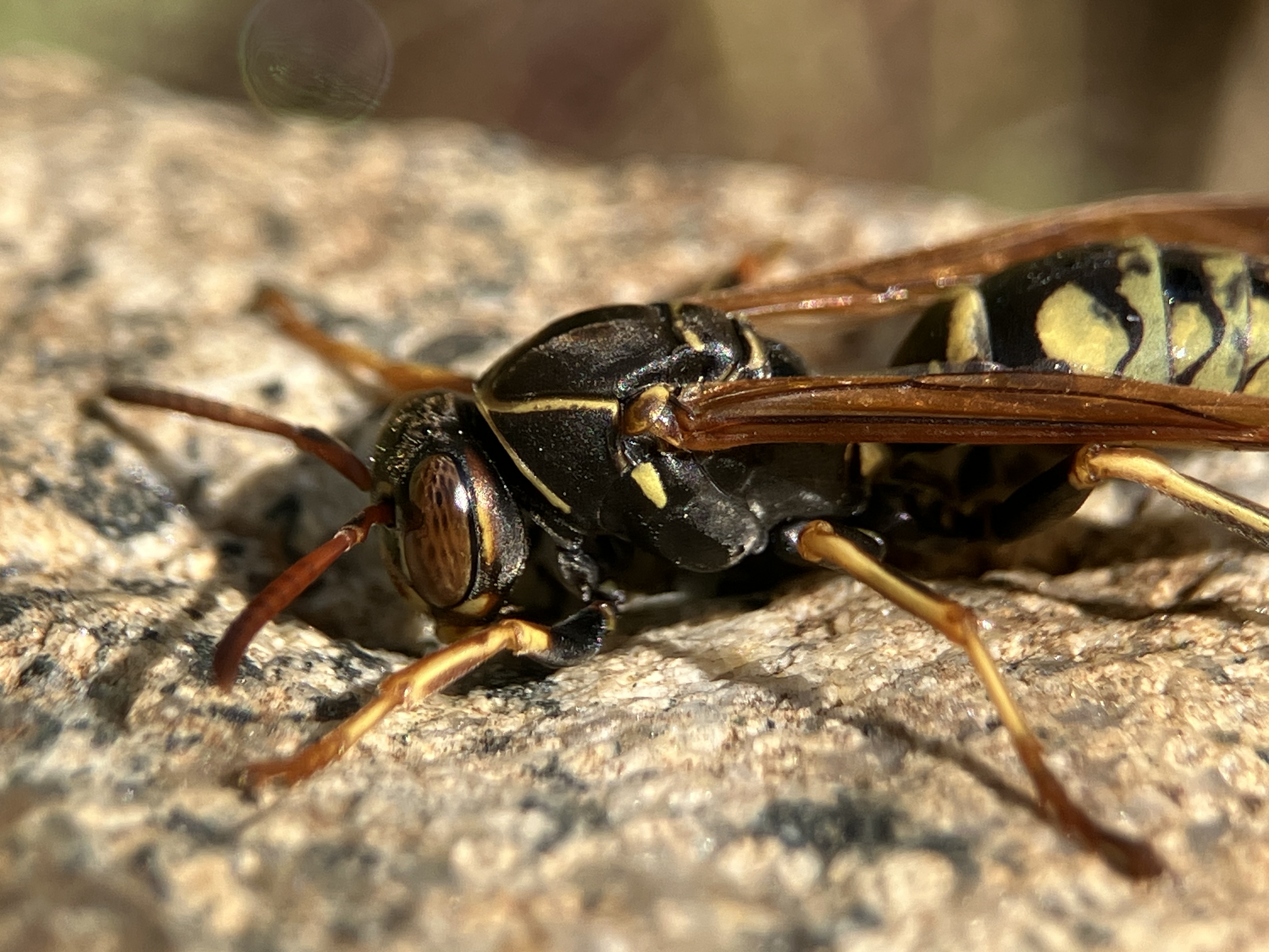 The other morning when I was watering our garden, I spied the most beautiful creature I’ve seen in a long time, a Golden Paper Wasp (Polistes aurifer). In fact, in sixteen years of living on San Juan Island, I have only seen one colony of these wasps (April 14, 2024) at the San Juan County Land Bank’s Mount Grant nature preserve. These wasps are native to North America and once considered a subspecies of Polistes fuscatus. However, P. aurifer has a western geographic distribution ranging from BC-CA to AB-MT-w.TX; ne. Mexico (Bugguide.net).