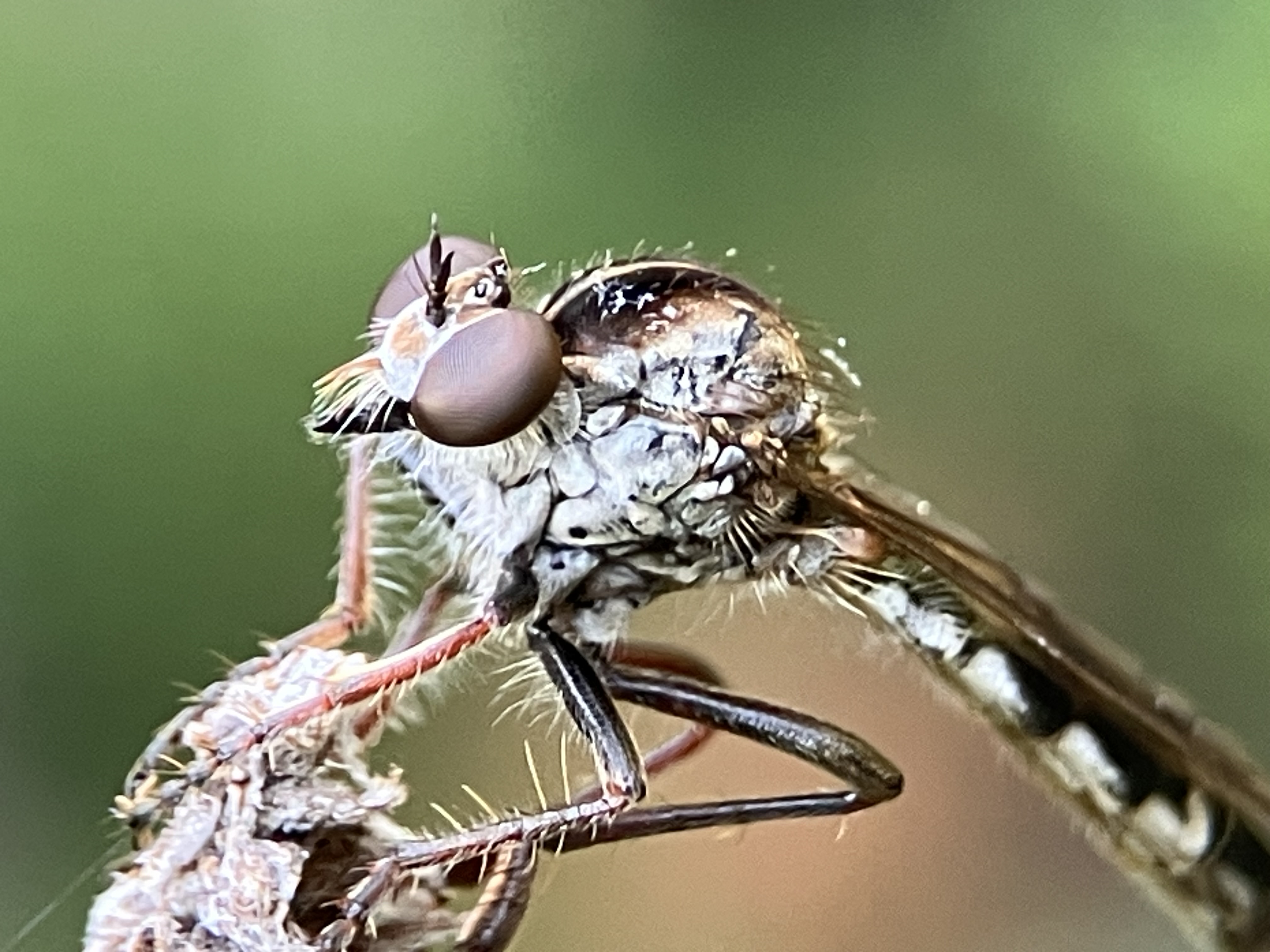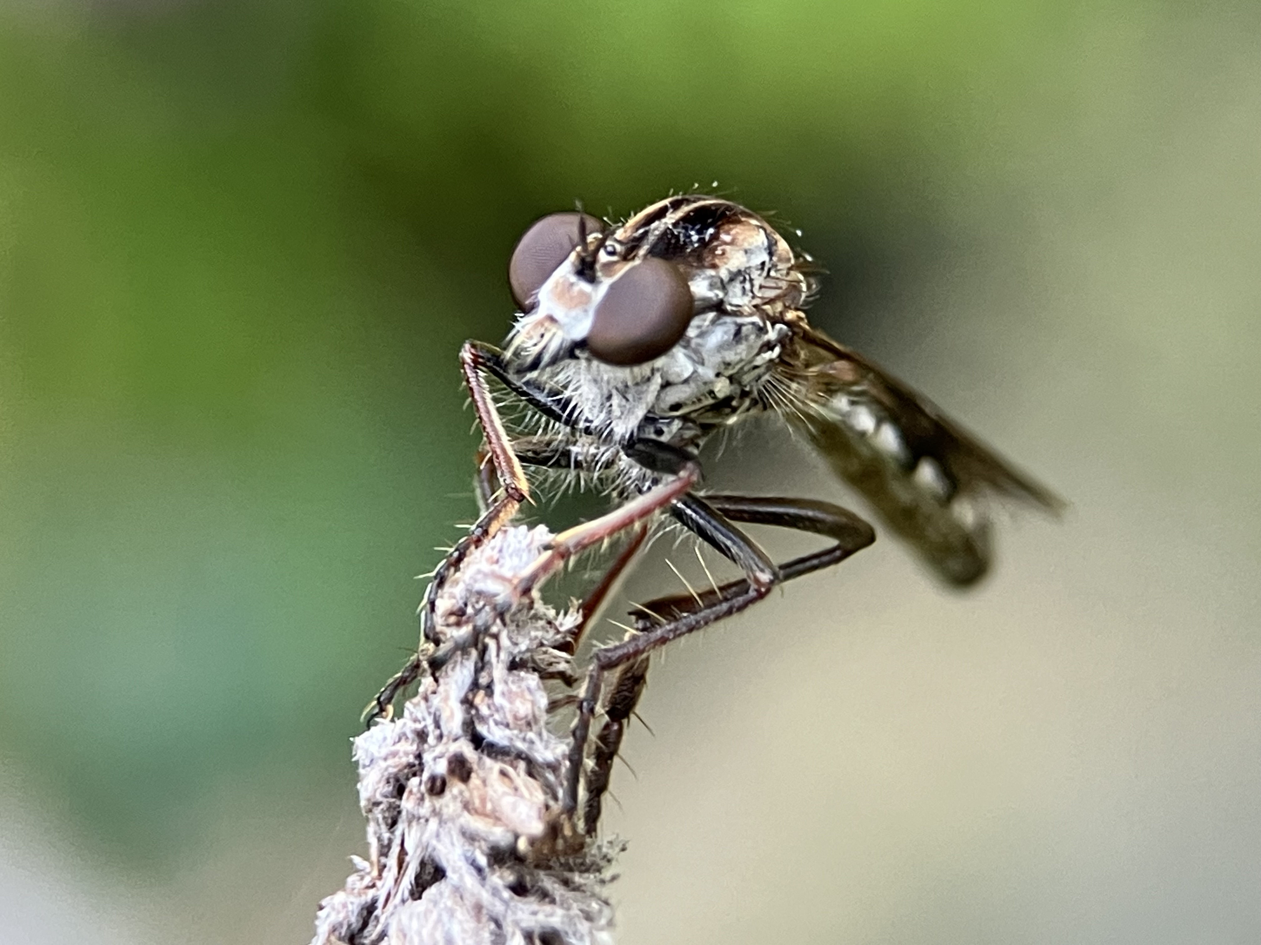 It has taken a bit of time to finally sort out genus and species for this very cool Robber fly with beautiful caramel-brown mottled wings I spied the evening of June 6, 2025. It perched on a dried apple mint stem from last season, no doubt scouting the terrain to see what might be on the menu for dinner. Robber flies (Family Asilidae) are predatory. They catch other small invertebrates to eat, paralyzing them with special salivary digestive enzymes and then sucking up the liquified contents through the proboscis (Cannings, 2013).