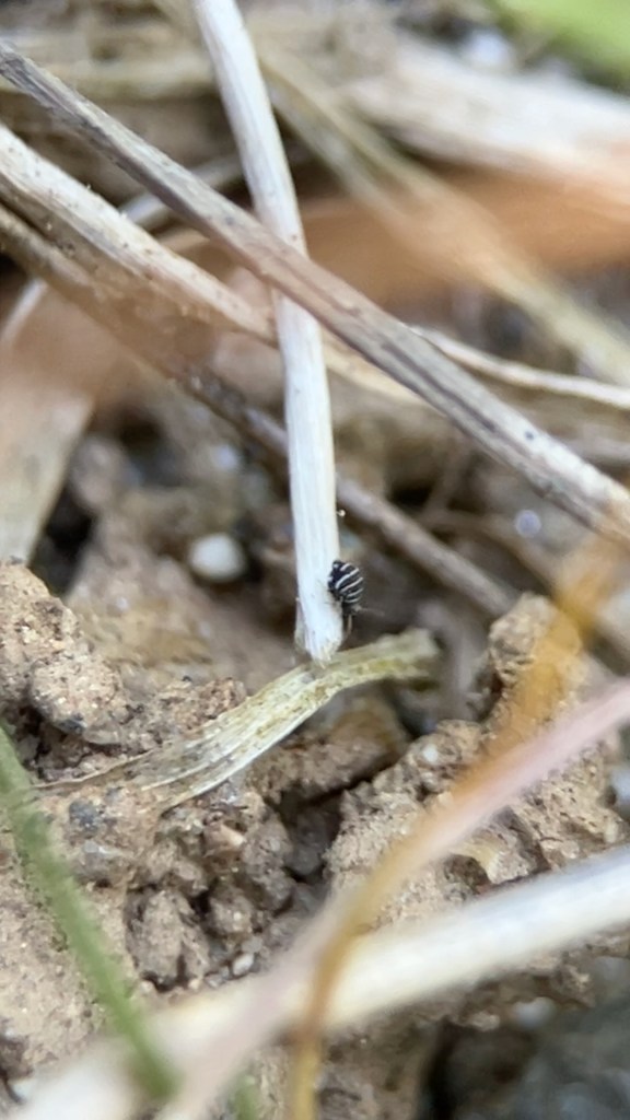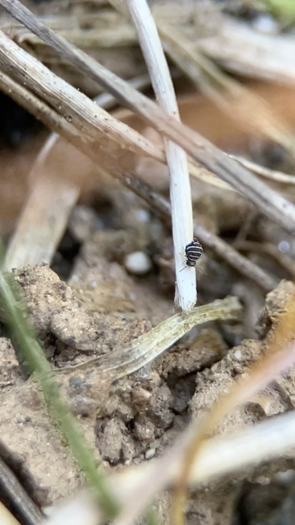 I was able to get one or two in focus. These springtails are incredibly small – perhaps only 1mm, and recognizable by the 5 transverse bands (jailbird stripes) across the dorsal abdomen. This species is unique among springtails in that while most species require moist habitats to survive, F. quinquefasciatus thrives in arid environments with little to no vegetation in areas with southern or south western exposure.