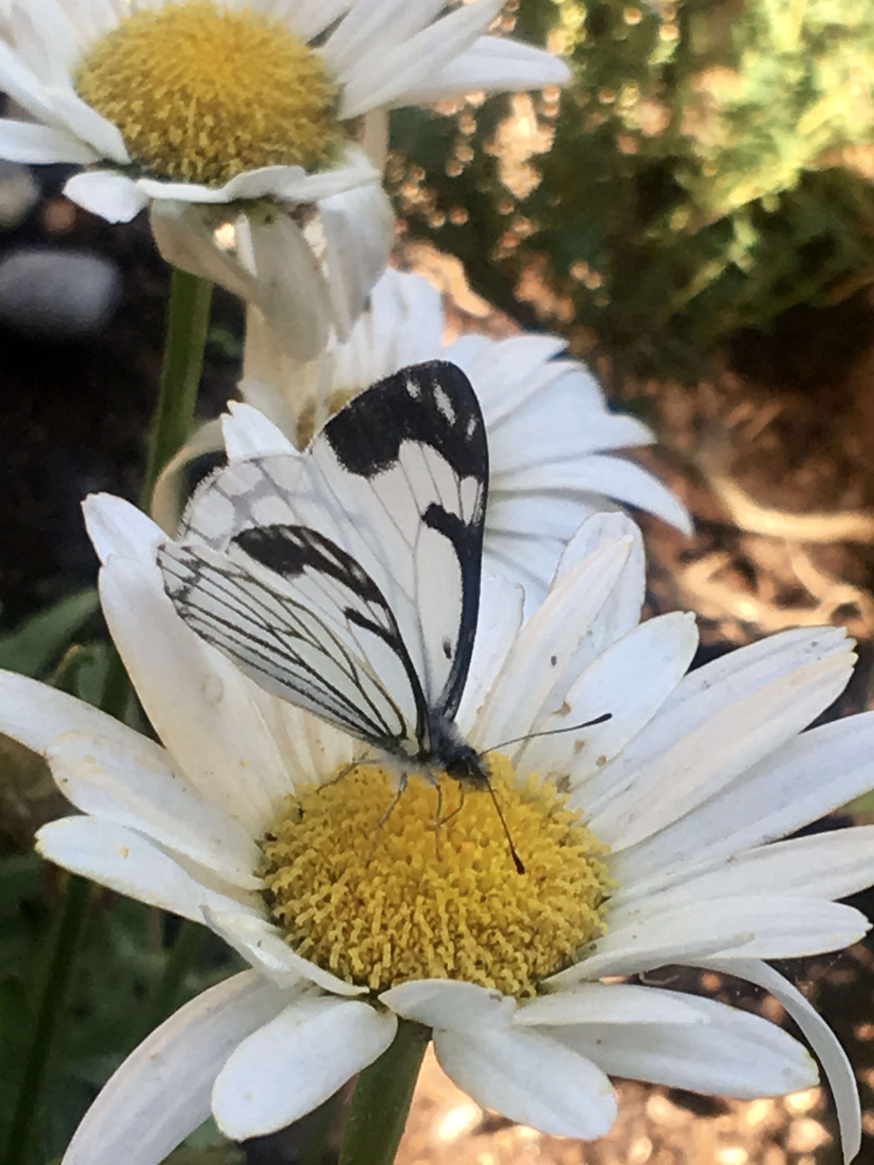 It was breezy earlier this afternoon when I spotted this beauty feeding on my daisies. This is a Neophasia menapia – or the Pine White Butterfly. I’ve been worried since we’ve put up deer fencing that the butterflies wouldn’t be able to find their way through the fence into my flower garden, but I shouldn’t have worried. The butterflies ever-so-gracefully float over the top.