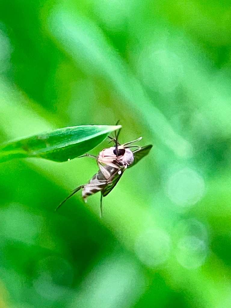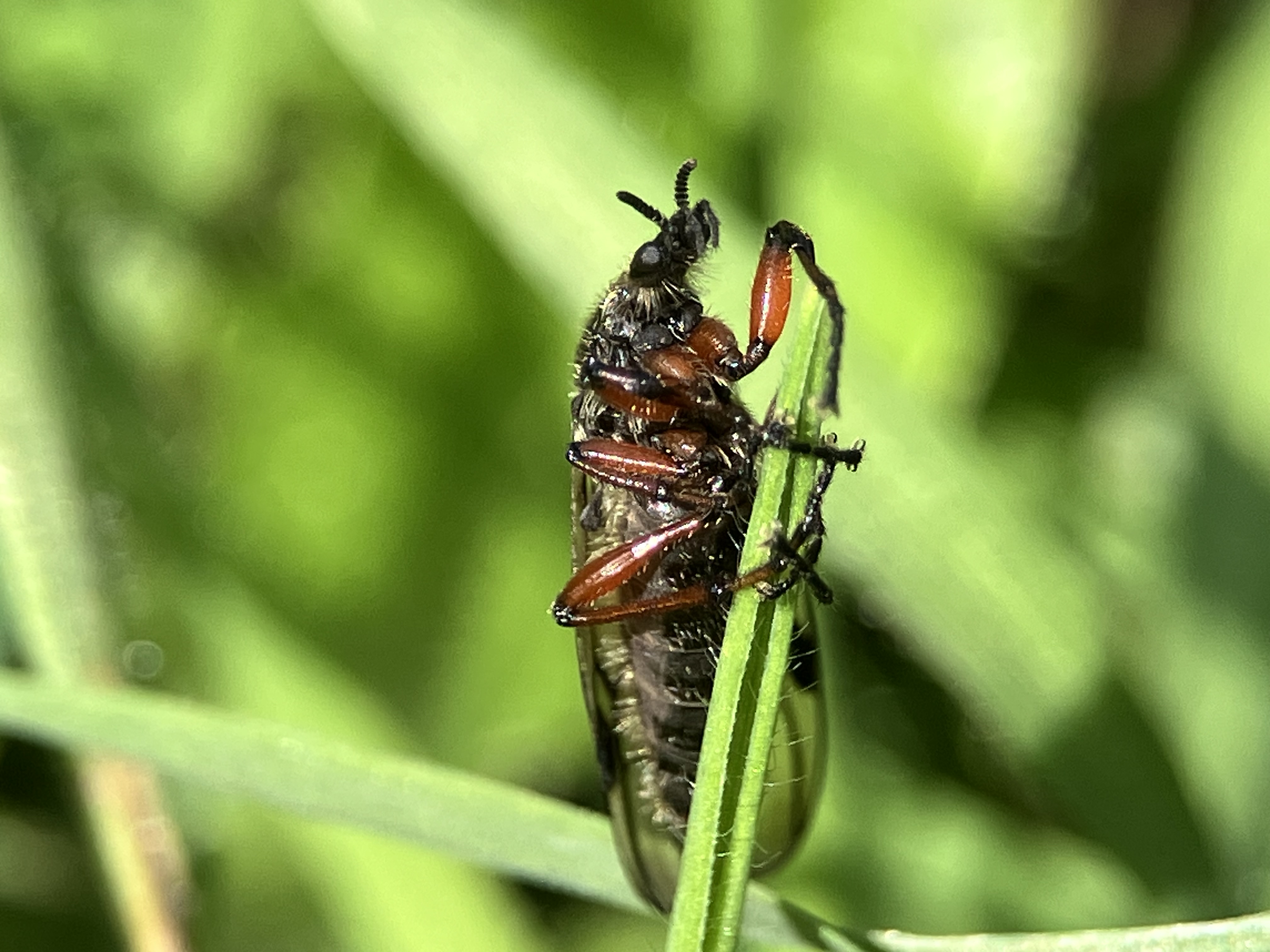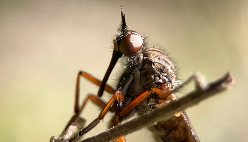 It has taken a bit of time to finally sort out genus and species for this very cool Robber fly with beautiful caramel-brown mottled wings I spied the evening of June 6, 2025. It perched on a dried apple mint stem from last season, no doubt scouting the terrain to see what might be on the menu for dinner. Robber flies (Family Asilidae) are predatory. They catch other small invertebrates to eat, paralyzing them with special salivary digestive enzymes and then sucking up the liquified contents through the proboscis (Cannings, 2013).