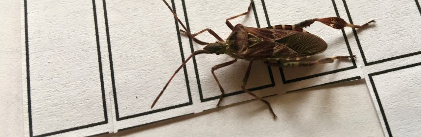 So, what is this bug? Well, it’s not a “bug,” it’s an INSECT. You know….6 legs, chitinous exoskeleton, antennae, three main body parts (head, thorax, and abdomen). More specifically, THIS INSECT is a Western Conifer Seed Bug (Leptoglossus occidentalis). It is classified in the order Hemiptera, family Coreidae (Leaf-footed Bugs and Squash Bugs).