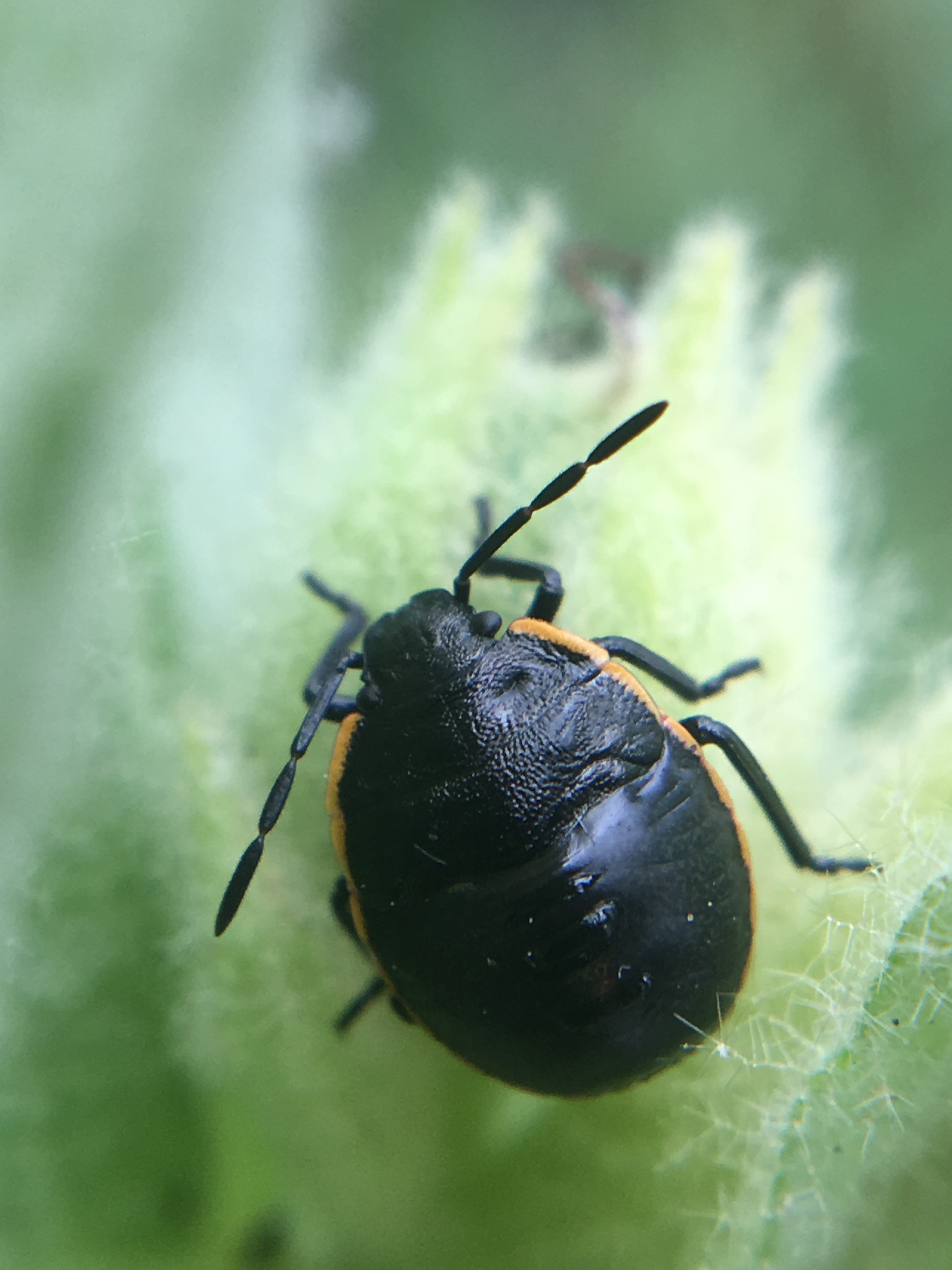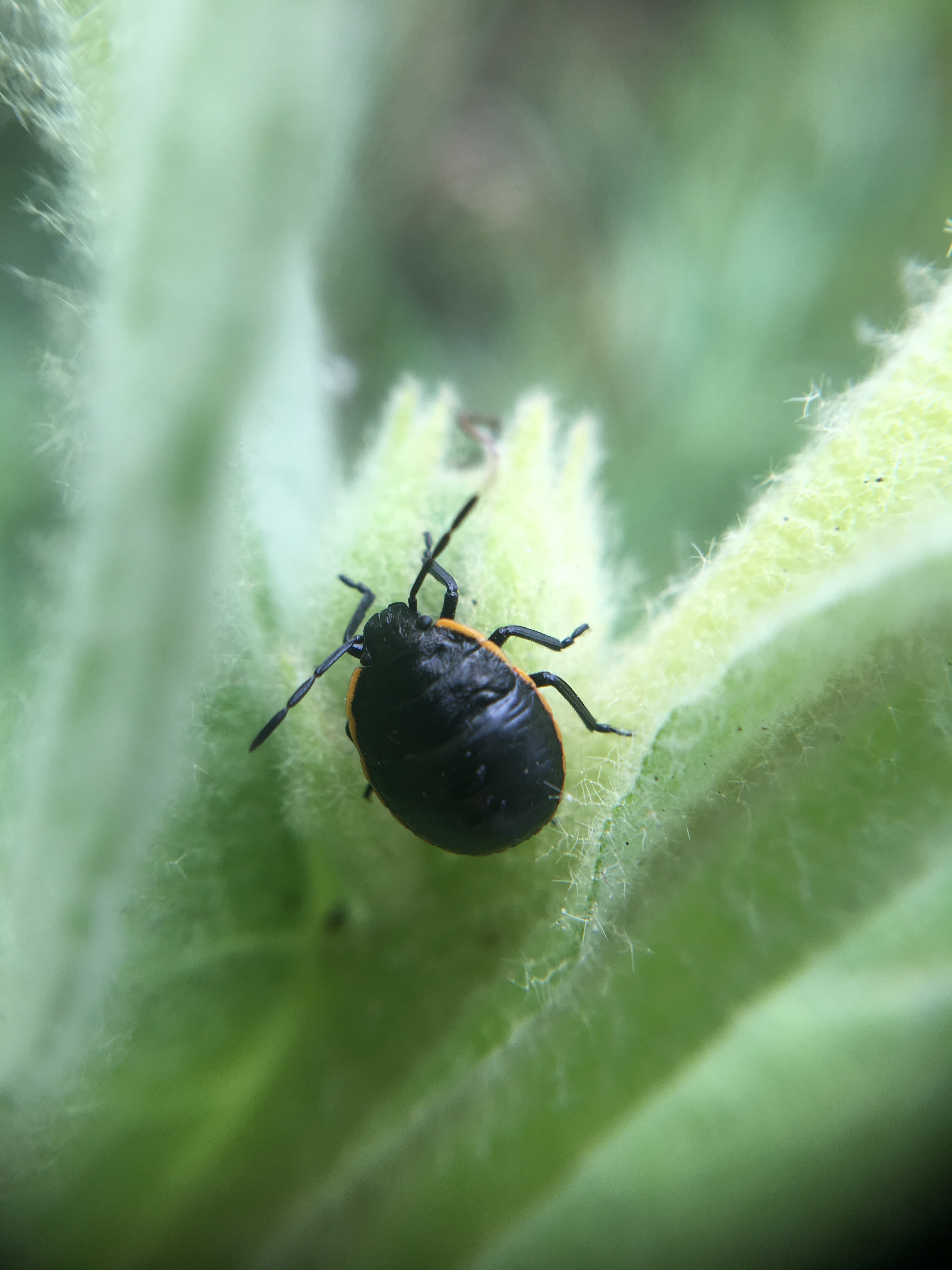 I spotted this round black bug yesterday on the leaf of a Mullein plant (Verbascum thapsus) yesterday (August 17, 2019). At first glance, you might think it a beetle, but upon closer examination, I recognized the yellowish outer margin from a larger, very similar specimen someone had asked me to identify earlier. This isn’t a beetle, but a BUG. True Bug, that is. It’s classified in the insect order Hemiptera. Hemiptera means “Half-wing” in Greek. This is a large order of insects with over 10,000 species in North America. It includes “bugs” like aphids, scale insects, cicadas, giant toe biters, stink and shield bugs (like this one!) and more.
