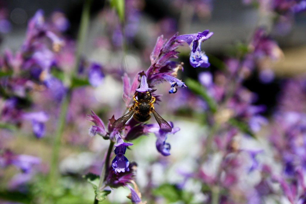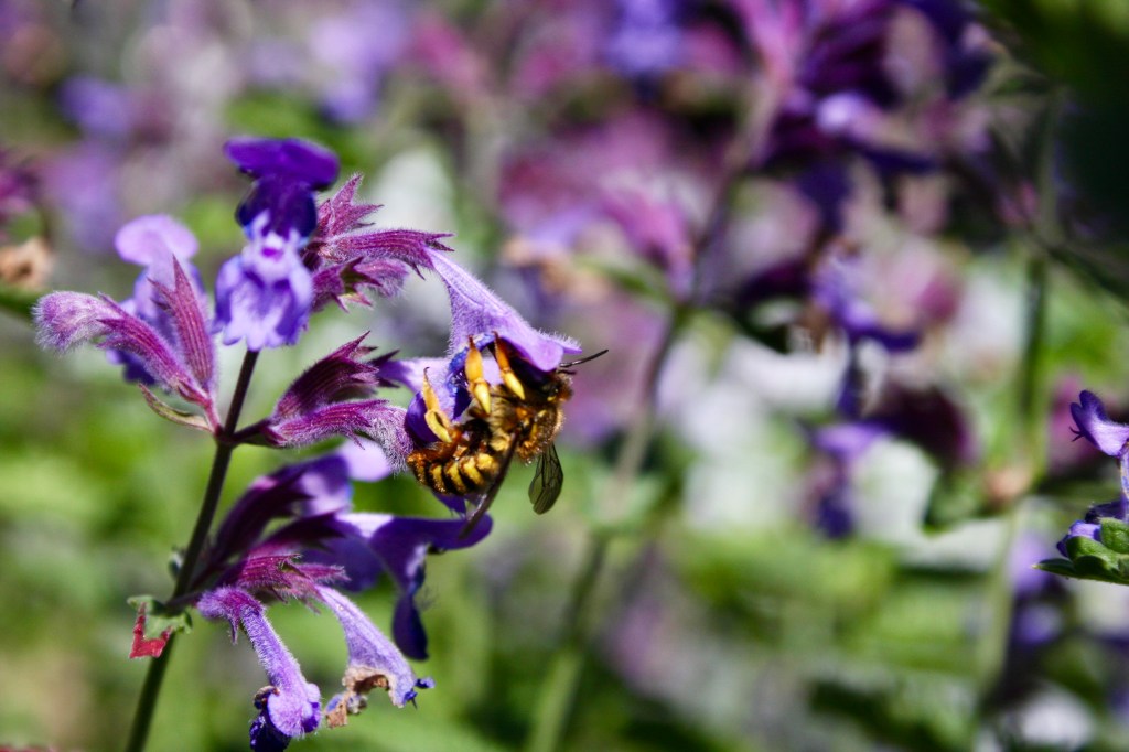 What are my recommendations? Well, I’ve shared why I quit keeping honey bees. We have a small orchard and keep a little vegetable garden where my husband helps me grow some strawberries, tomatoes, peas, salad greens, and a few other things. The past few seasons, because of my affinity for bug viewing over gardening, I planted some things near my garden plants that I knew would attract pollinators. For instance, I have Nepeta varieties of catmint near my tomatoes. Those purpley-blue flowers on the catmint attract all sorts of pollinators who also happen to visit my tomatoes, peas, strawberries, and more.