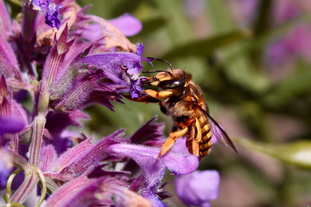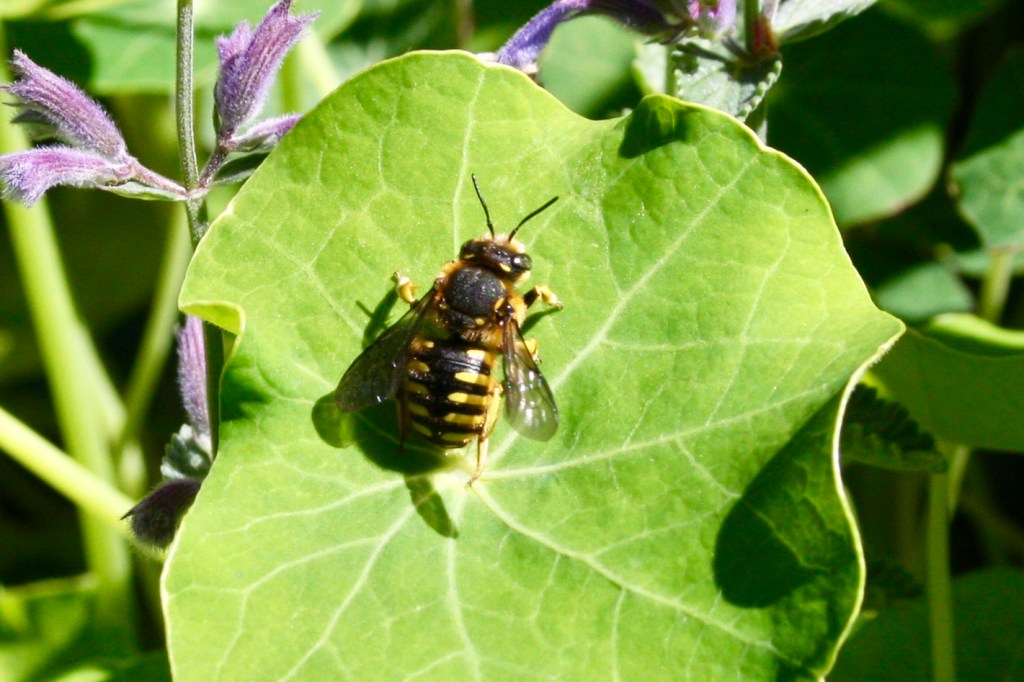 Other than sipping nectar from flowers, these solitary, cavity nesters are all about finding wool to make a cozy bed for their babies. Actually, aside from the uhm…deed, the female is the one doing all the provisioning for a nest. She will card “wool,” using her mandibles to scrape bits of trichomes (or hairs) from lambs ears or other fuzzy plants (especially those in the mint family) to make a cushioned bed on which to lay her egg. Each egg is provisioned with enough nectar and pollen to supply the developing larva with nutrients to reach pupation.