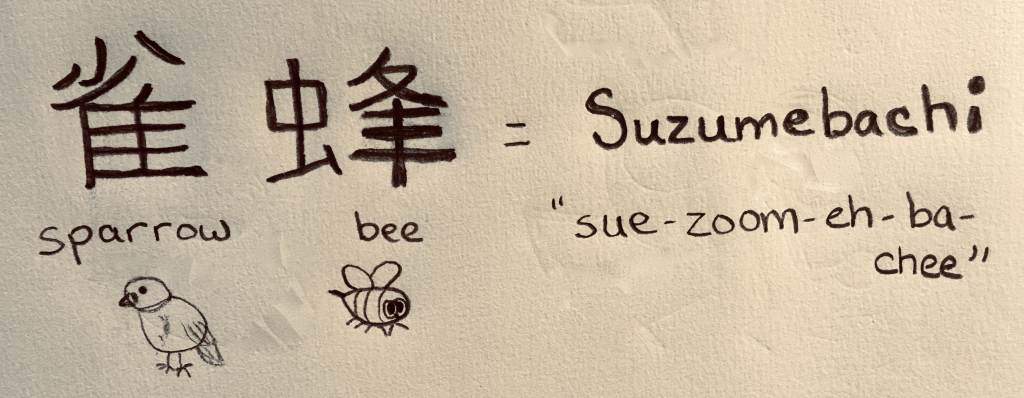 First off, the Japanese name for the wasps is Suzumebachi. Say “Sue zoom eh ba chee” and you’re close. Suzumebachi translates into “sparrow-bee.”
