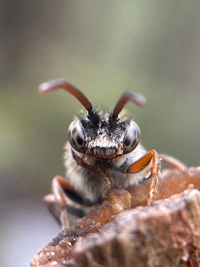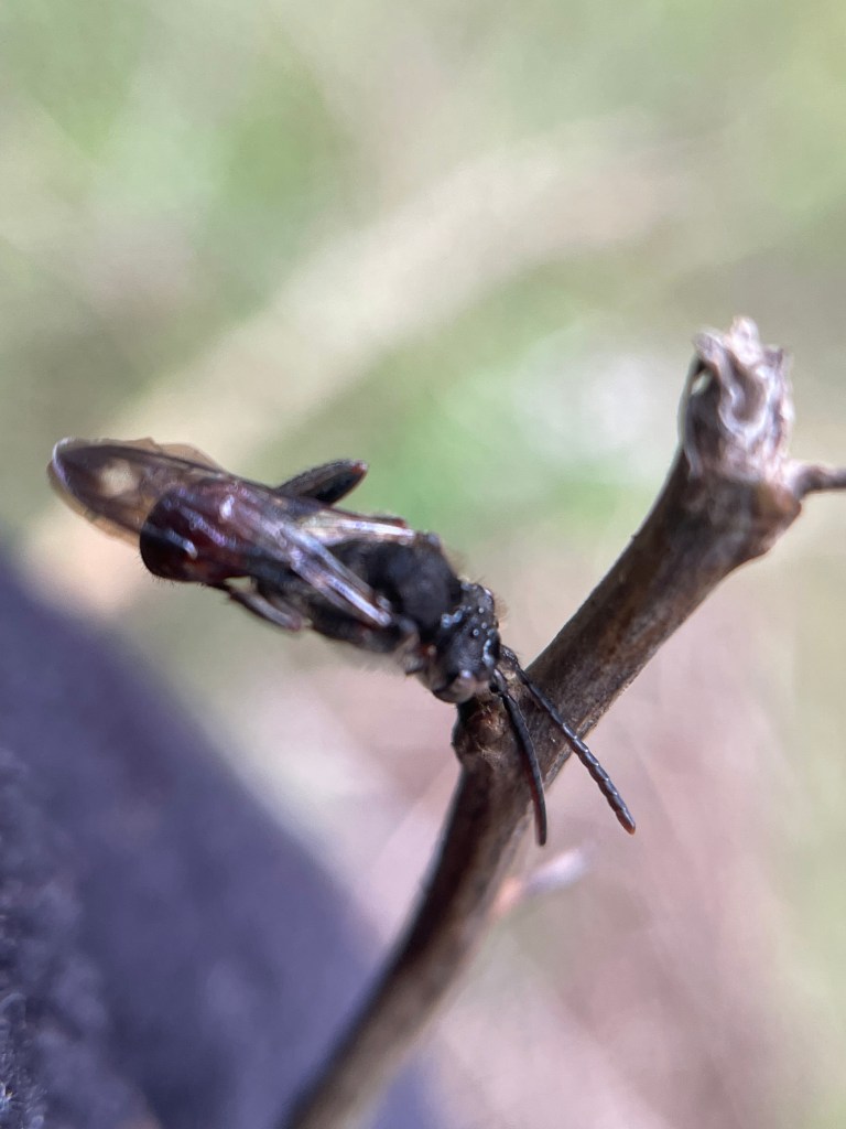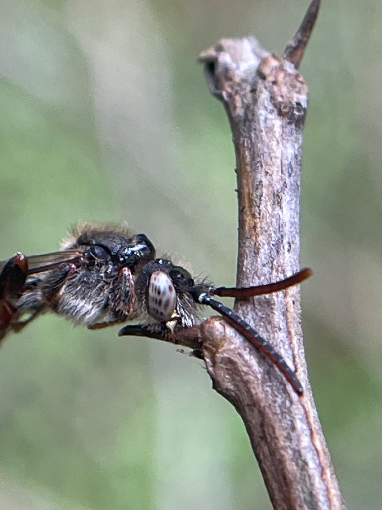 I learned something new today about bees that I did not know. My friend, Eric Eaton’s wife (link to Eric’s book about wasps in my Read More section) , shared with me that some bees will often sleep in this manner, attached to a substrate like this thorn or a twig, by their mandibles. Thanks Heidi! 🙂