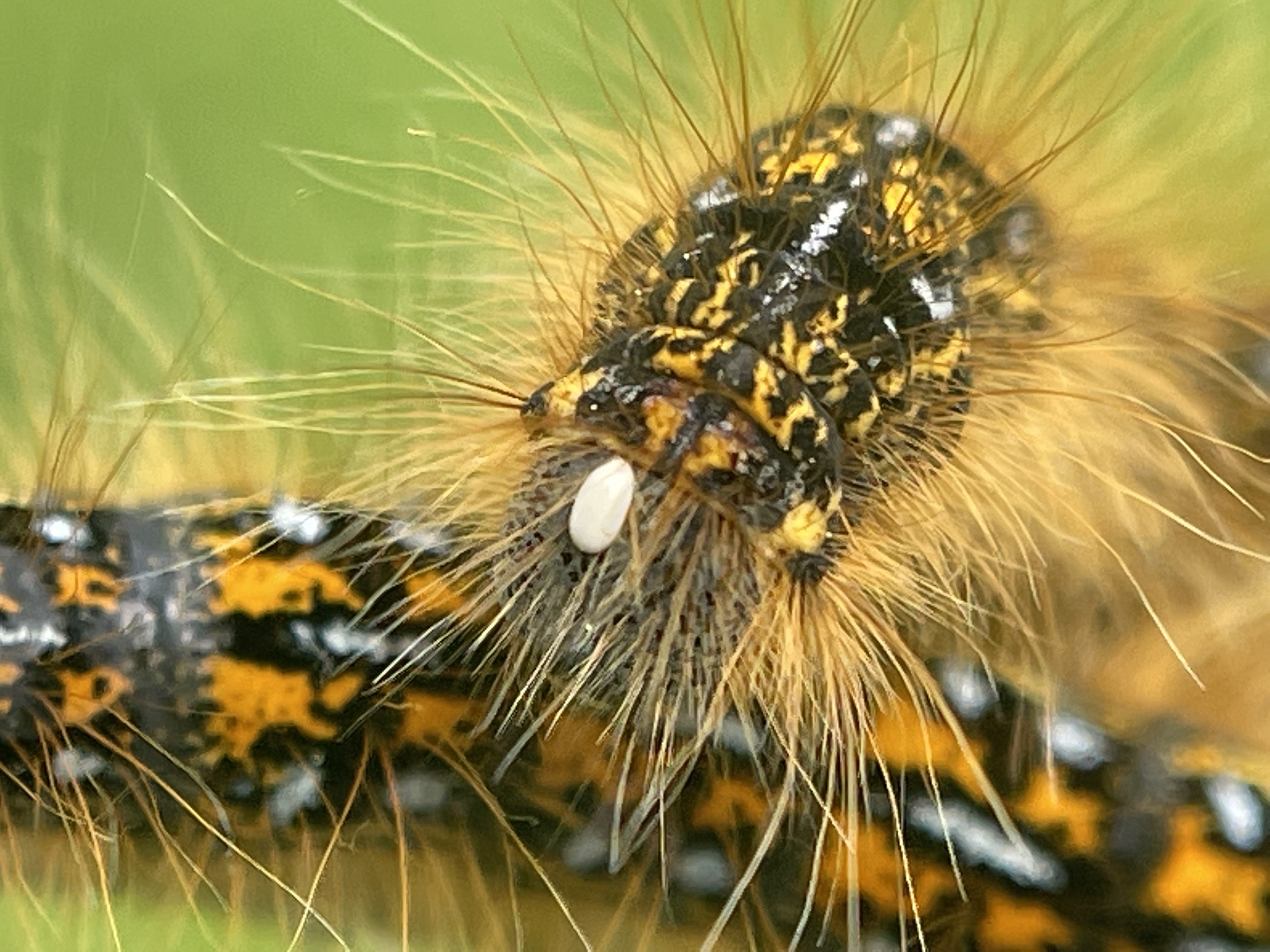 Western Tent Caterpillar with Tachinid Fly egg on headWestern Tent Caterpillars (Malocosoma californicum pluviale) with deceased individuals in background likely affected by nucleopolyhedrovirus