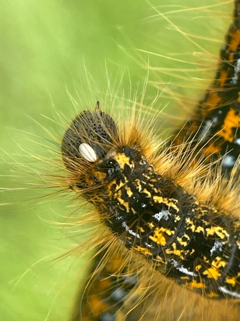The photos below show something that happens to the tent caterpillars we may not notice in our panic to eradicate them from our trees. The egg on the caterpillar was laid by a parasitic Tachinid fly. It chose the head, so the caterpillar can’t chew it off its body. The egg is shed when the caterpillar molts, but the fly is already developing inside the caterpillar. It will literally eat the caterpillar from the inside out. So, when you clip off those tents and throw them into the fire, you are also killing the natural and best pest predators along with them. Naturus interruptus! We do more harm than good by intervening.