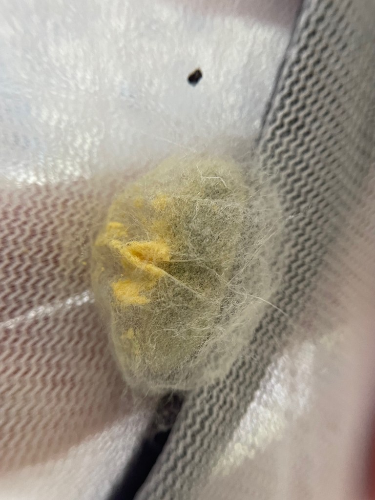 One was a suspected Black Widow that turned out to be a look-a-like False Widow (Steatoda grossa). While instinctively protective of the little sack of clustered eggs laid in a matrix of messy web in the plastic cup, I could sense she was alarmed. I was able to remove the lid and take a few photos without disturbing her too much. For now, she remains in the plastic cup. I may relocate her and her egg sack to our greenhouse tomorrow. Steatoda grossa spiders are not medically significant to humans. She’s a friend. Her presence helps keep the actual black widow spiders from colonizing our homes.