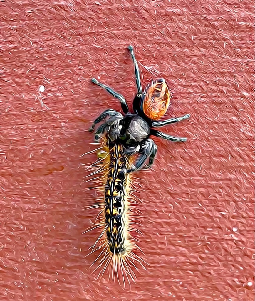 Earwigs and Jumping spider eat tent caterpillars