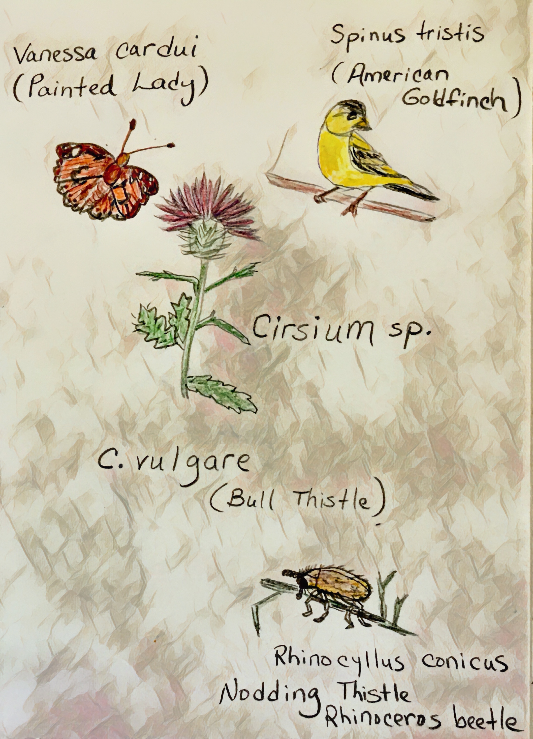 I’ll leave you with a question. Should we have introduced this hairy little beetle that isn’t native? I don’t have a good answer. Maybe it will just help control the spread of thistle and won’t eradicate it entirely. I’d like to be able to have Painted Lady’s, Goldfinches, and lots of jumping spiders in my garden, even if I occasionally get pricked by the spines of those thistles. For now, I’m going to stick to improving my drawing skills!